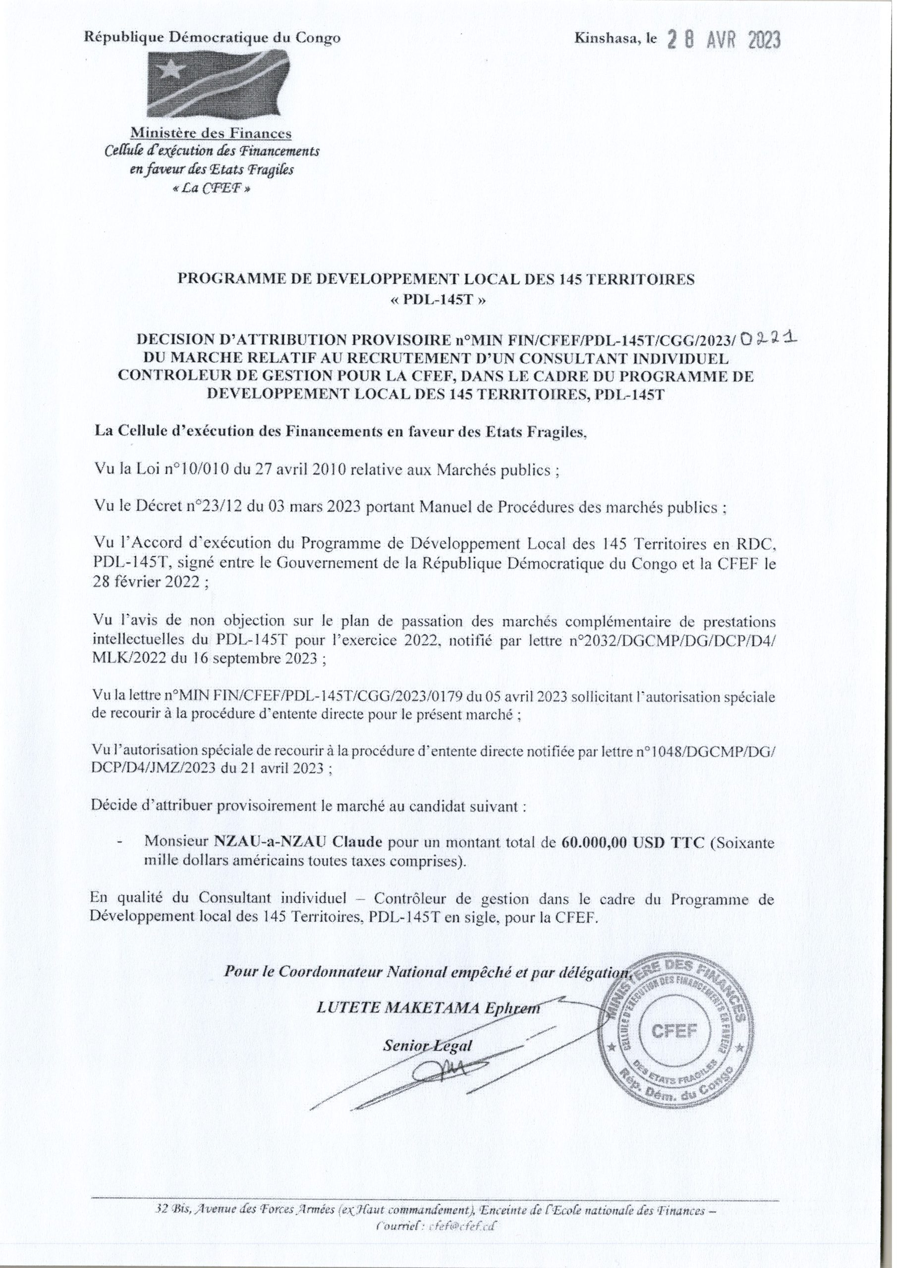 Attribution provisoire de la CFEF accordée à Monsieur Nzau-a-Nzau relative au Recrutement d’un consultant Individuel contrôleur de Gestion pour la CFEF, dans le cadre du programme de développement local des 145 Territoires.