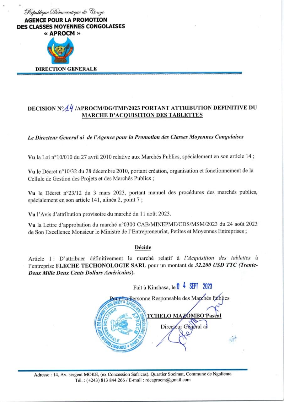 Attribution provisoire de l’APROCEM accordée à l’Entreprise FLECHE TECHNOLOGIE relative à l’acquisition des tablettes