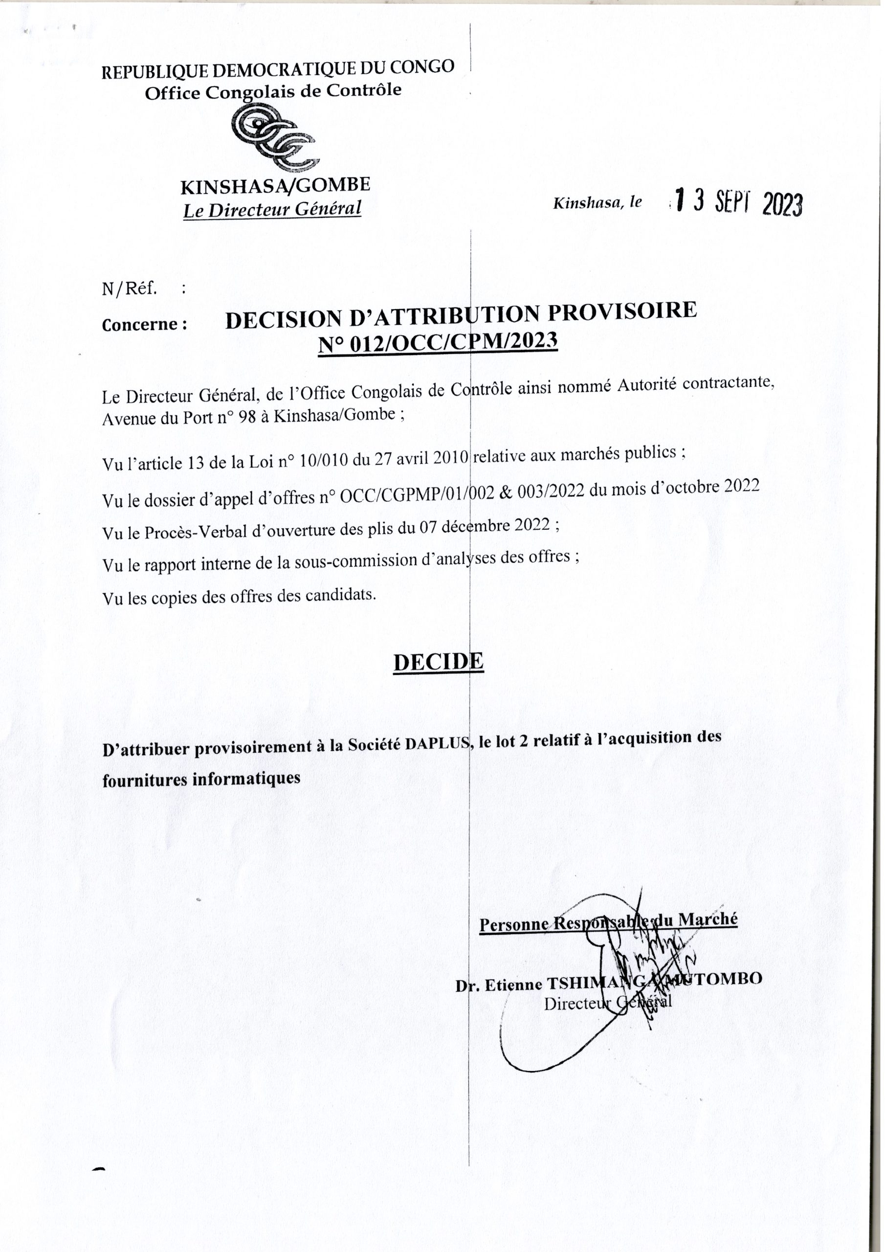 Attribution provisoire de l’OCC accordée à la société DAPLUS, lot 2 relative à l’acquisition des fournitures informatiques