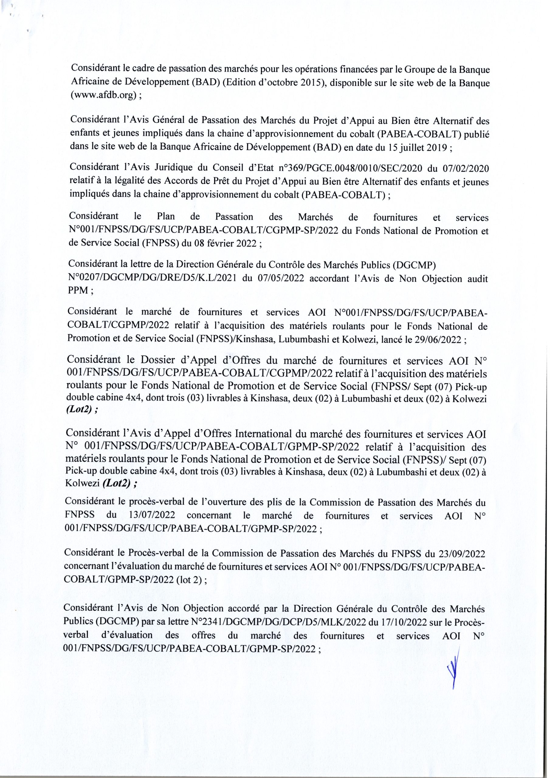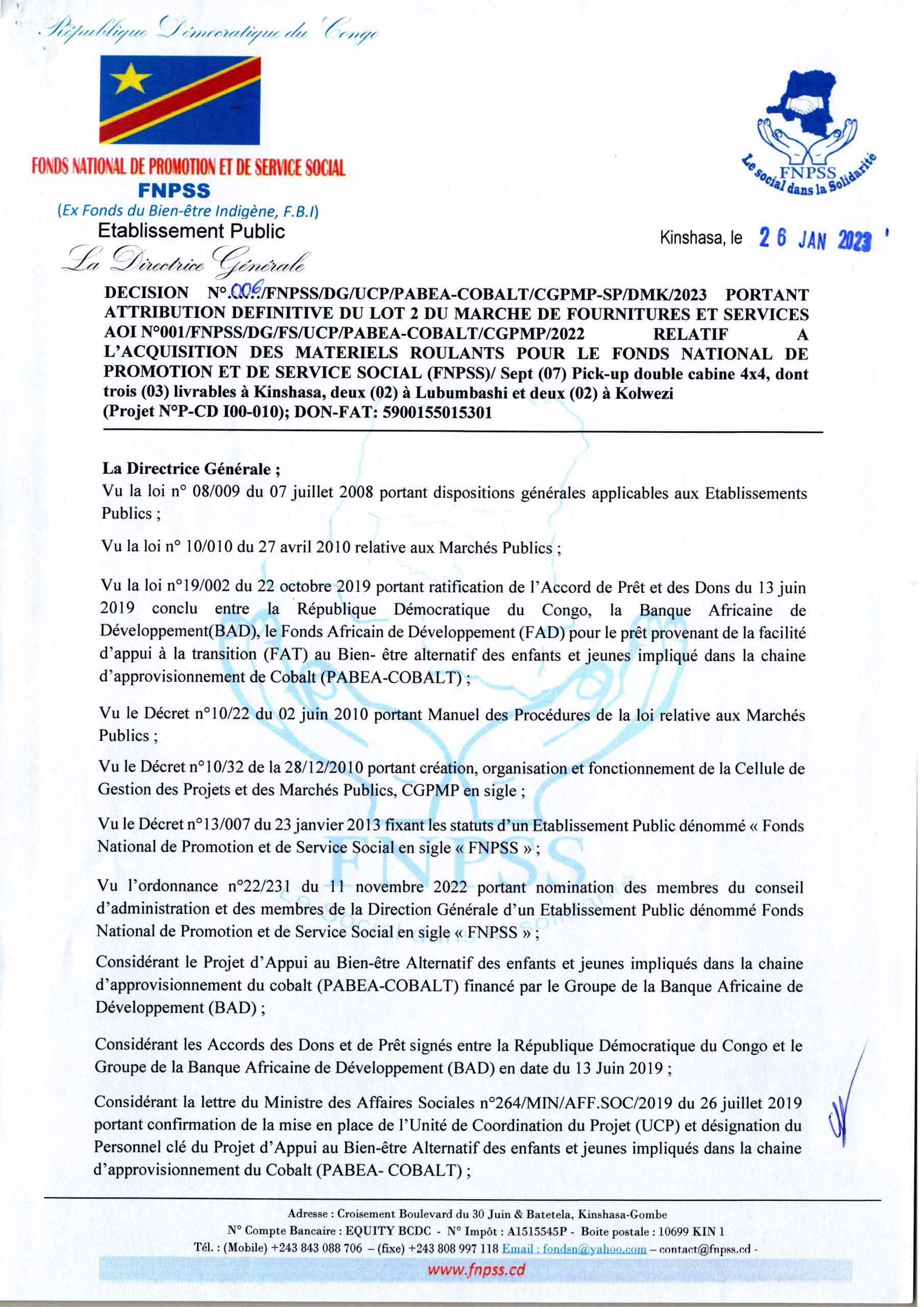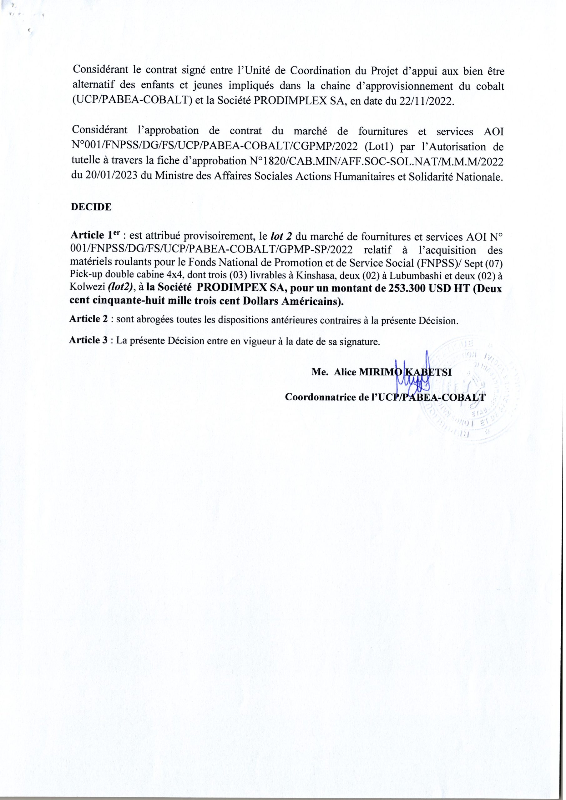 Attribution provisoire du FNPSS accordée à la société PRODIMPEX relative à l’acquisition des matériels roulants pour le Fonds National de Promotion et de Service Social (FNPSS) lot 2.