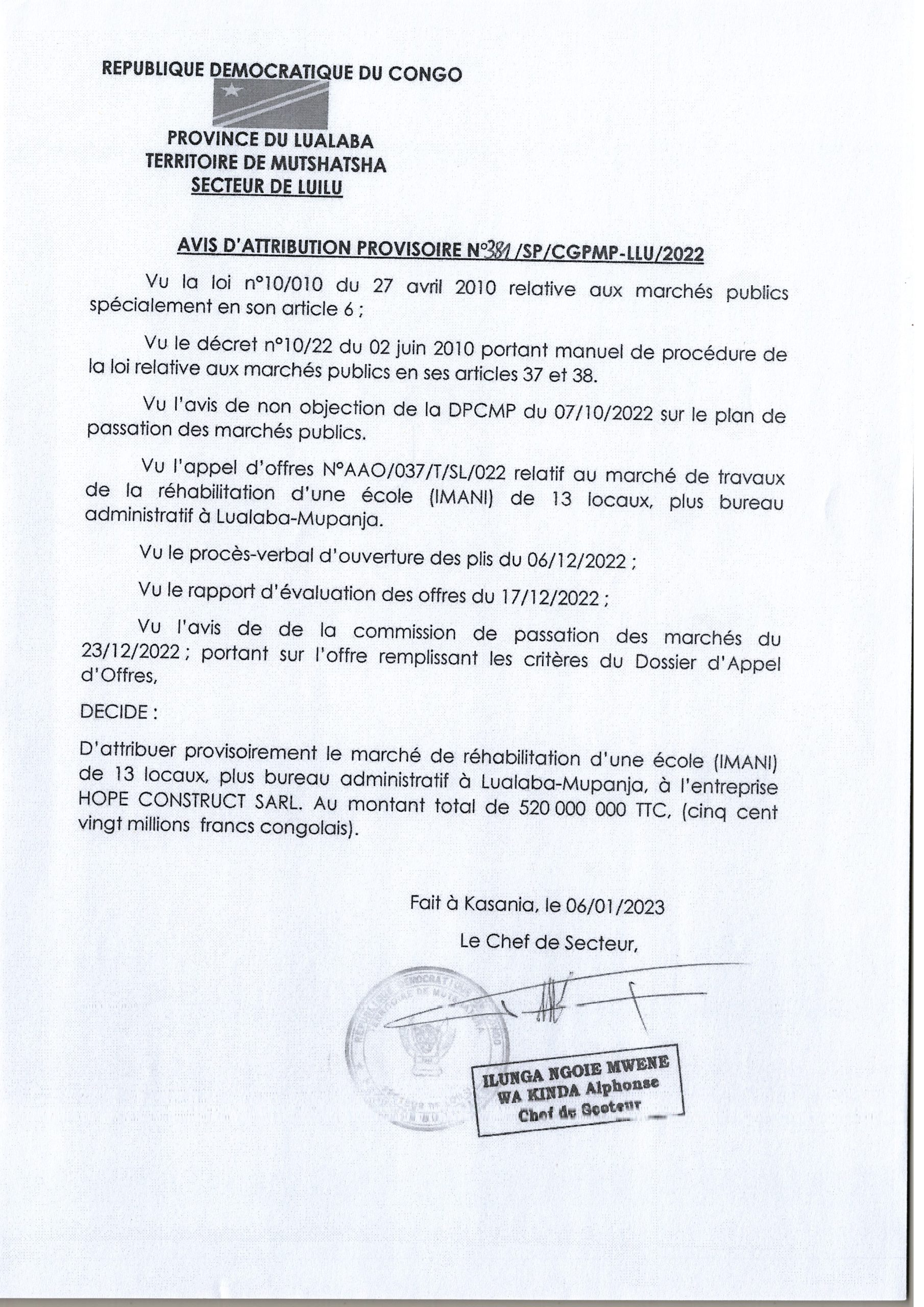 Attribution provisoire du marché du Province du LUALABA accordée à l’Entreprise HOPE CONSTRUCT Relative à la réhabilitation d’une école (IMANI) de 13 locaux, plus bureau administratif à Lualaba-Mupanja.