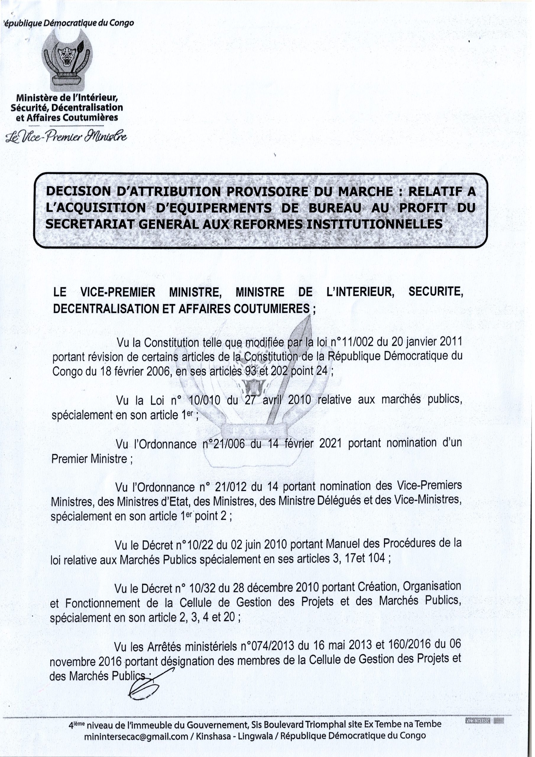 Attribution provisoire du ministère accordée aux établissements lokela relative au marché d’acquisition d’équipements de bureau au profit du secrétariat général aux réformes institutionnelles.
