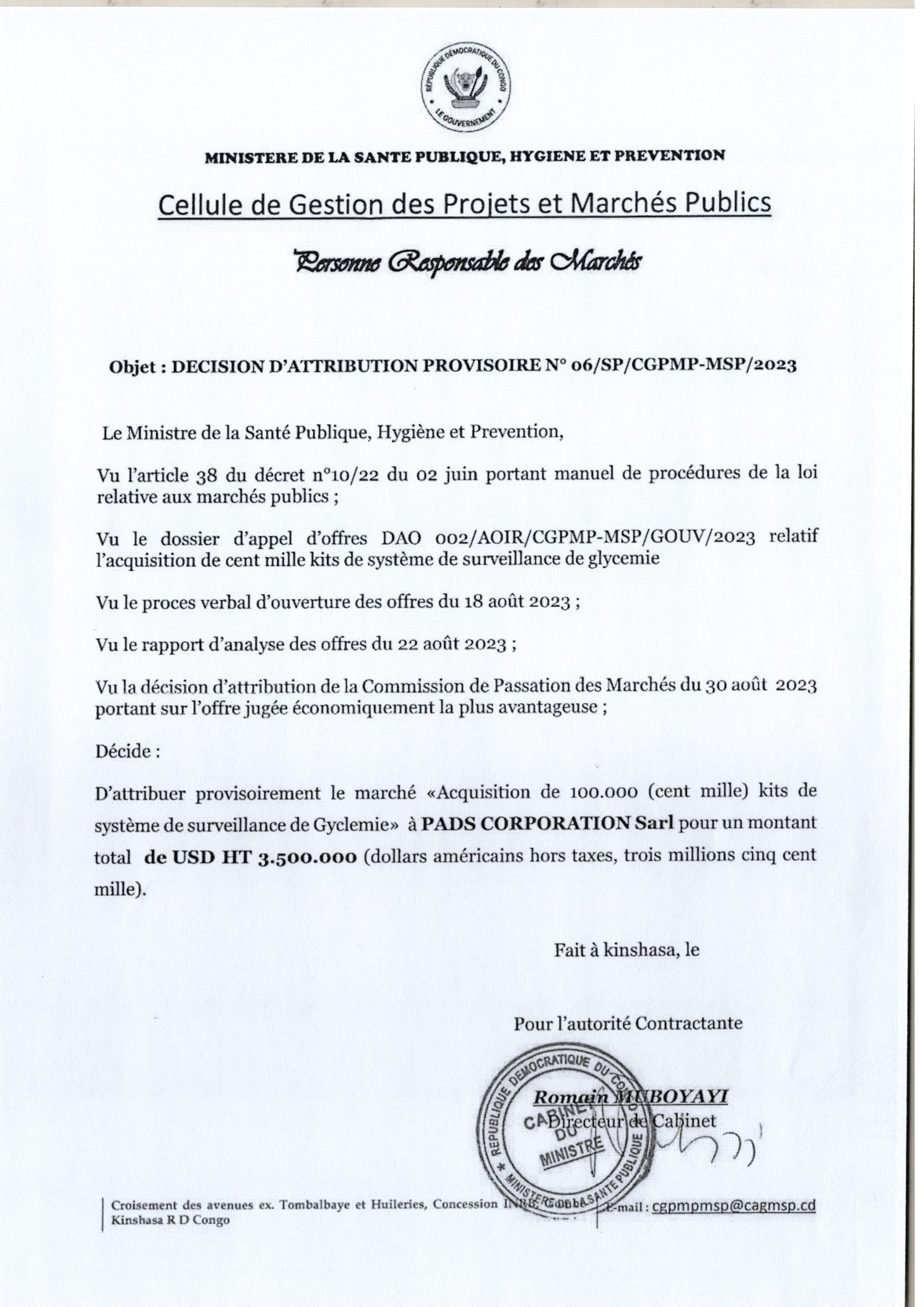 Attribution provisoire du ministère de la Santé accordée à PADS CORPORATION relative à l’acquisition de 100.000 (cent mille) kits de système de surveillance de Gyclemie