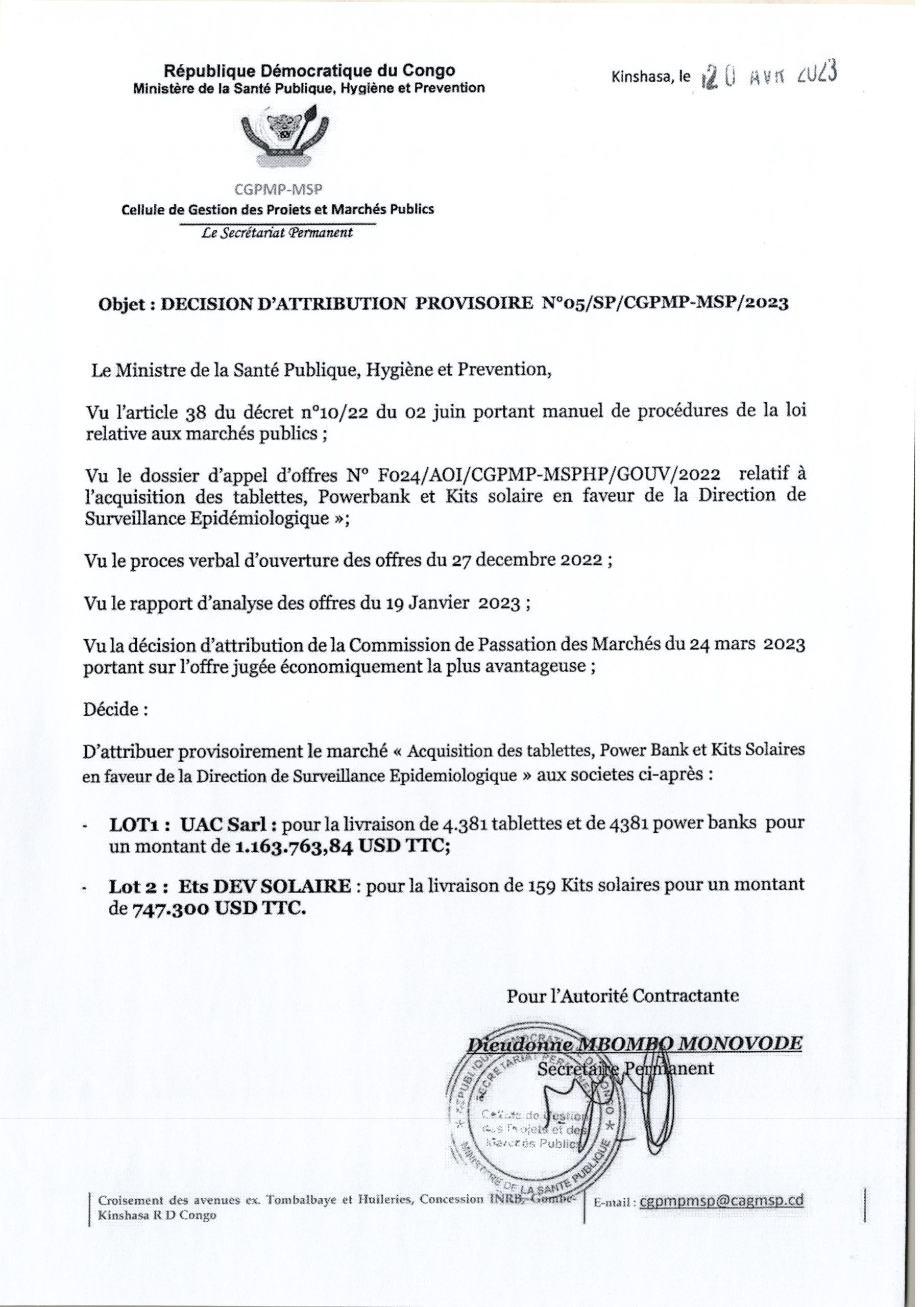 Attribution provisoire du Ministère de la Santé Publique, Hygiène et Prevention accordée à : lot 1 à UAC et lot 2 à Ets DEV SOLAIRE relative à l’Acquisition des tablettes, Power Bank et Kits Solaires en faveur de la Direction de Surveillance Epidémiologique.