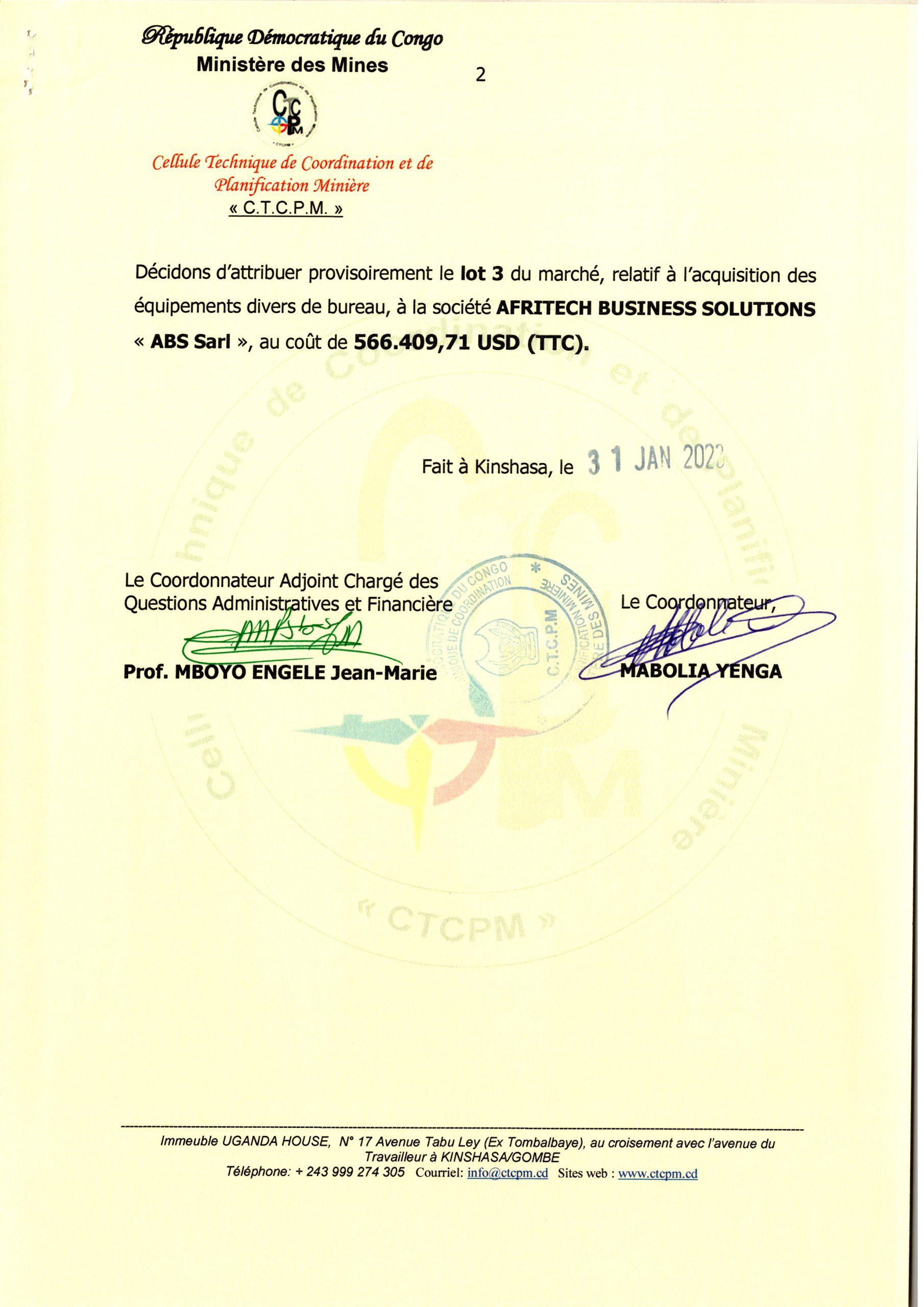 Attribution provisoire du Ministère des Mines accordée à la société AFRITECH BUSINESS SOLUTIONS relative à l’acquisition des équipements divers de bureau (Lot 3)