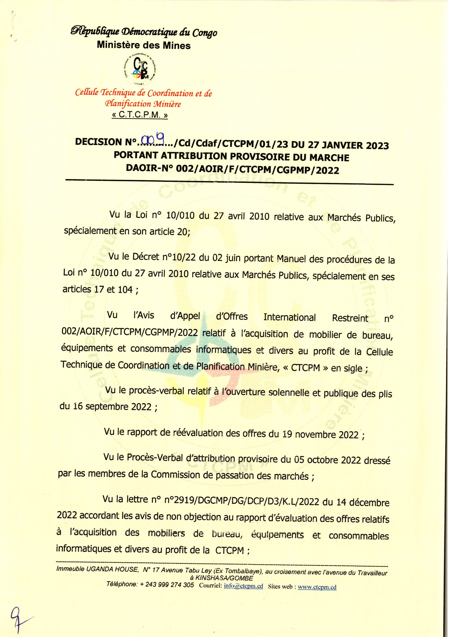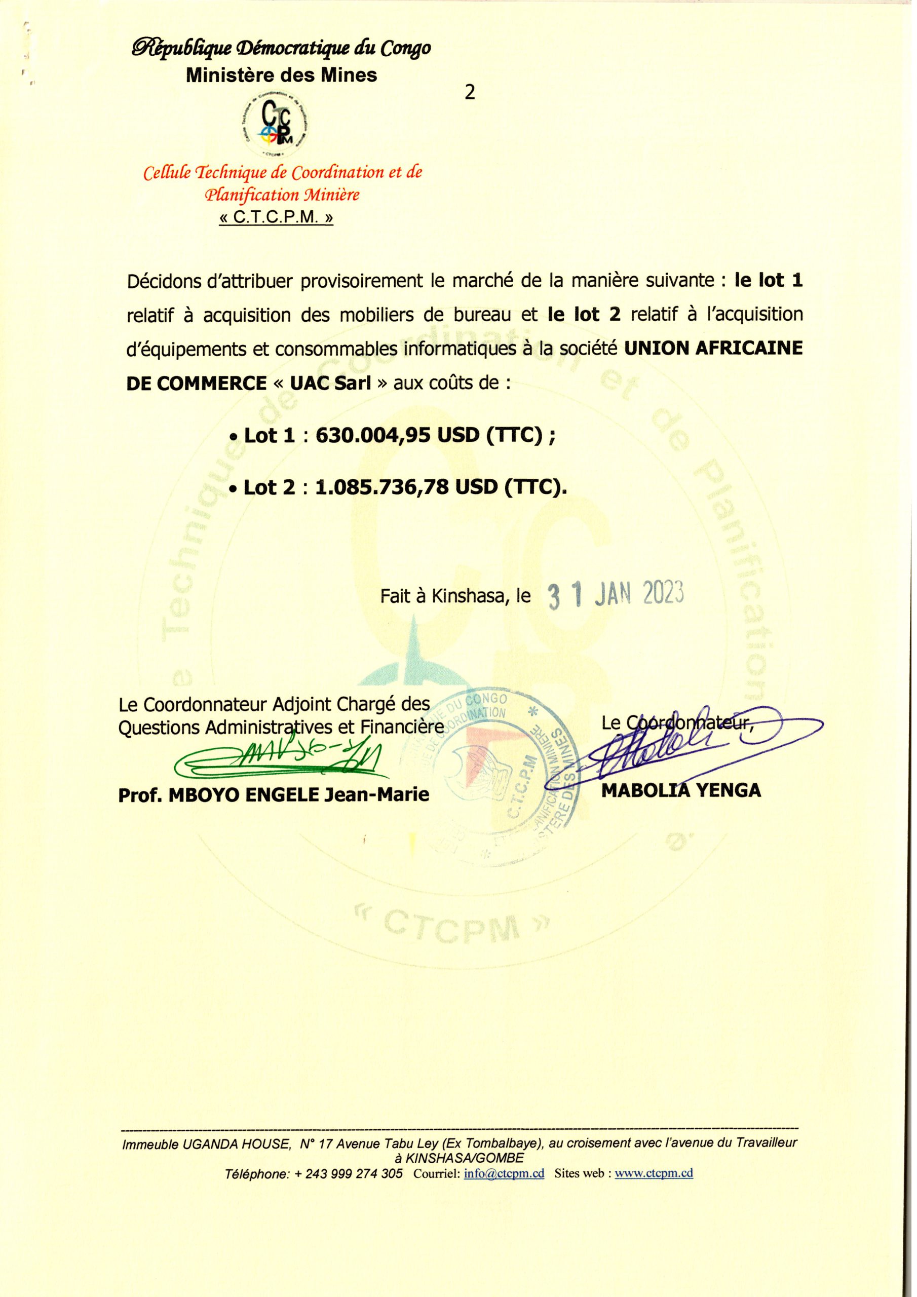 Attribution provisoire du Ministère des Mines accordée à la société UAC Relative à l’acquisition des mobiliers de bureau (lot 1) et à l’acquisition d’équipements et consommables informatiques (lot 2).