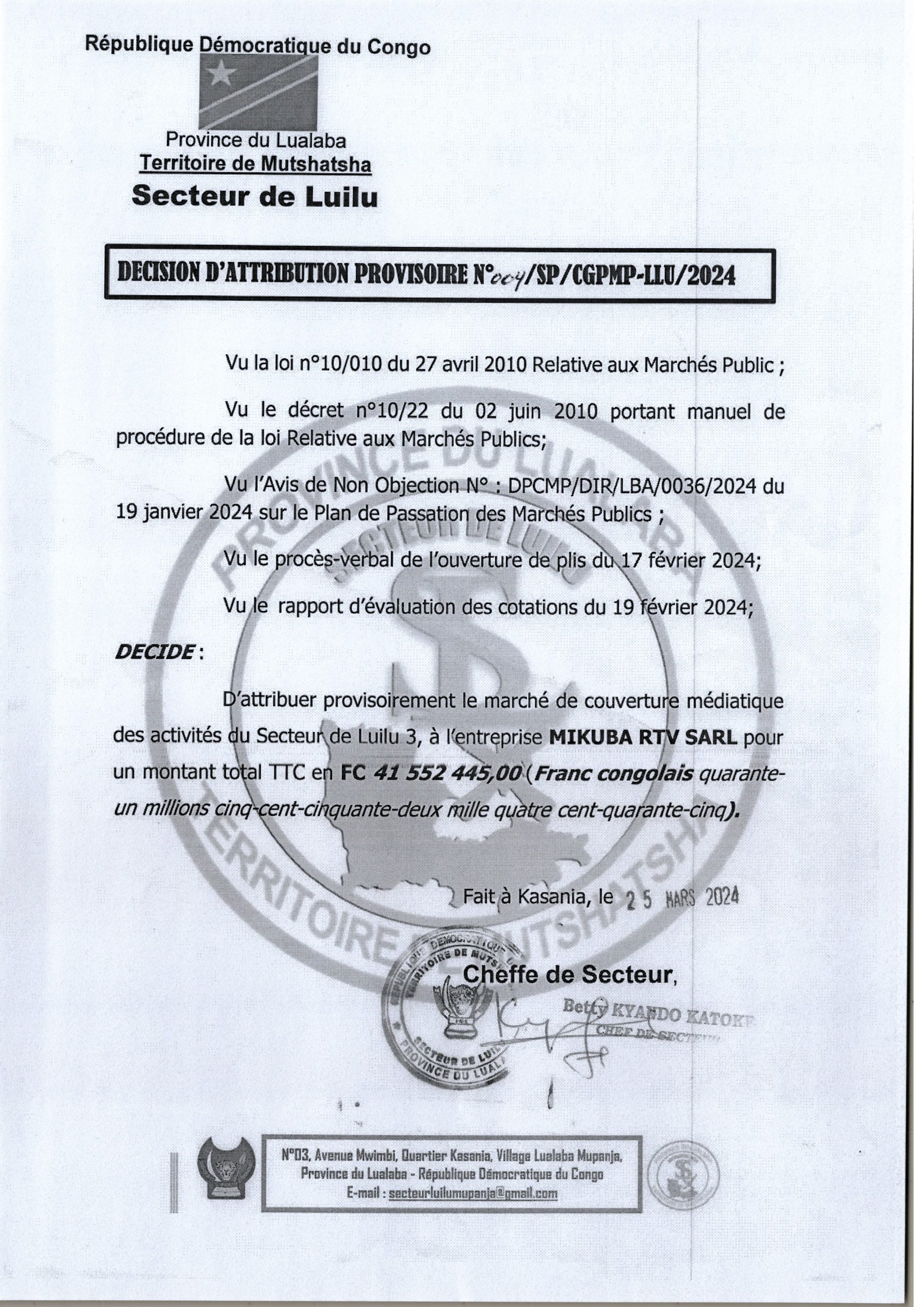 Attribution provisoire du Secteur de LUILU accordée à l’Entreprise MIKUBA RTV relative à la couverture médiatique des activités du Secteur de Luilu