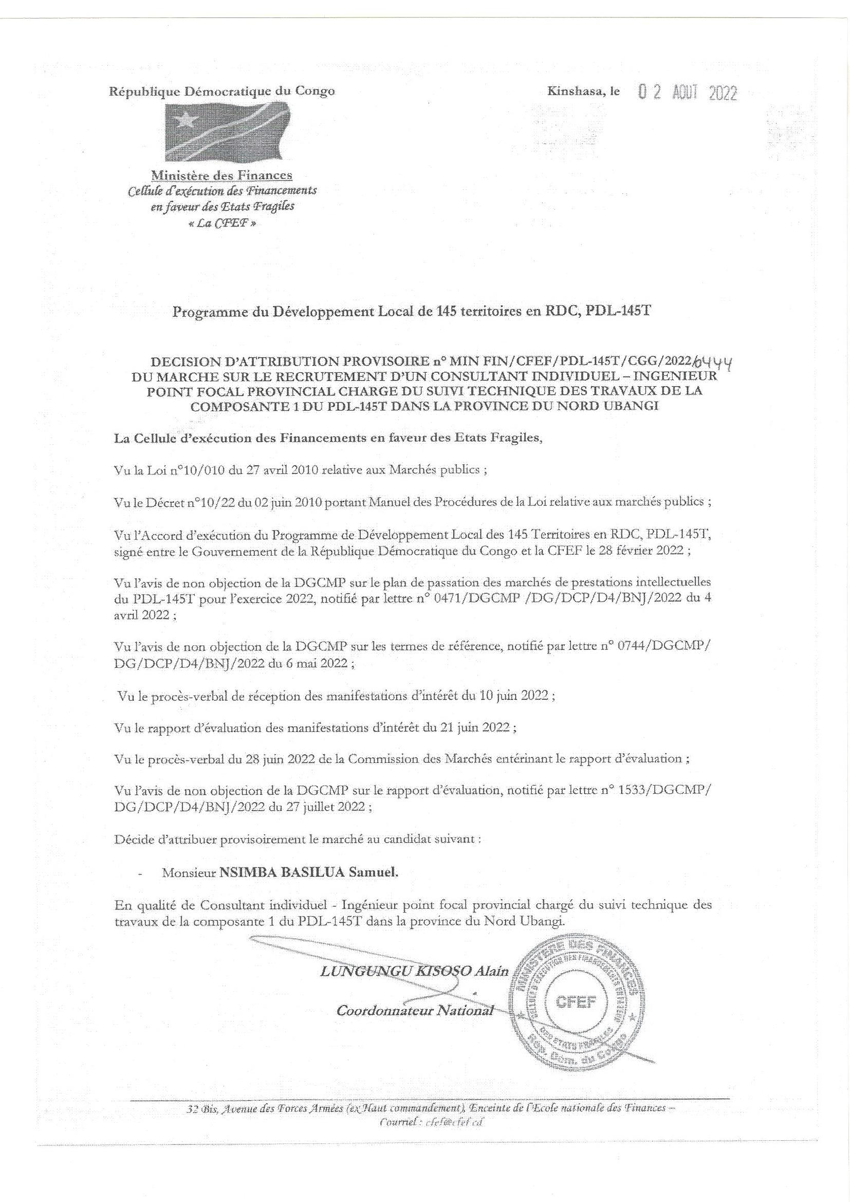 DECISION D’ATTRIBUTION PROVISOIRE D’UN CONSULTANT INDIVIDUEL ACCORDEE A Mr NSIMBA BASILUA Samuel EN QUALITE D’ UN INGENIEUR POINT FOCAL PROVINCIAL CHARGE DU SUIVI TECHNIQUE DES TRAVAUX DE LA COMPOSANTE 1 DU PDL-145T DANS LE NORD UBANGI.