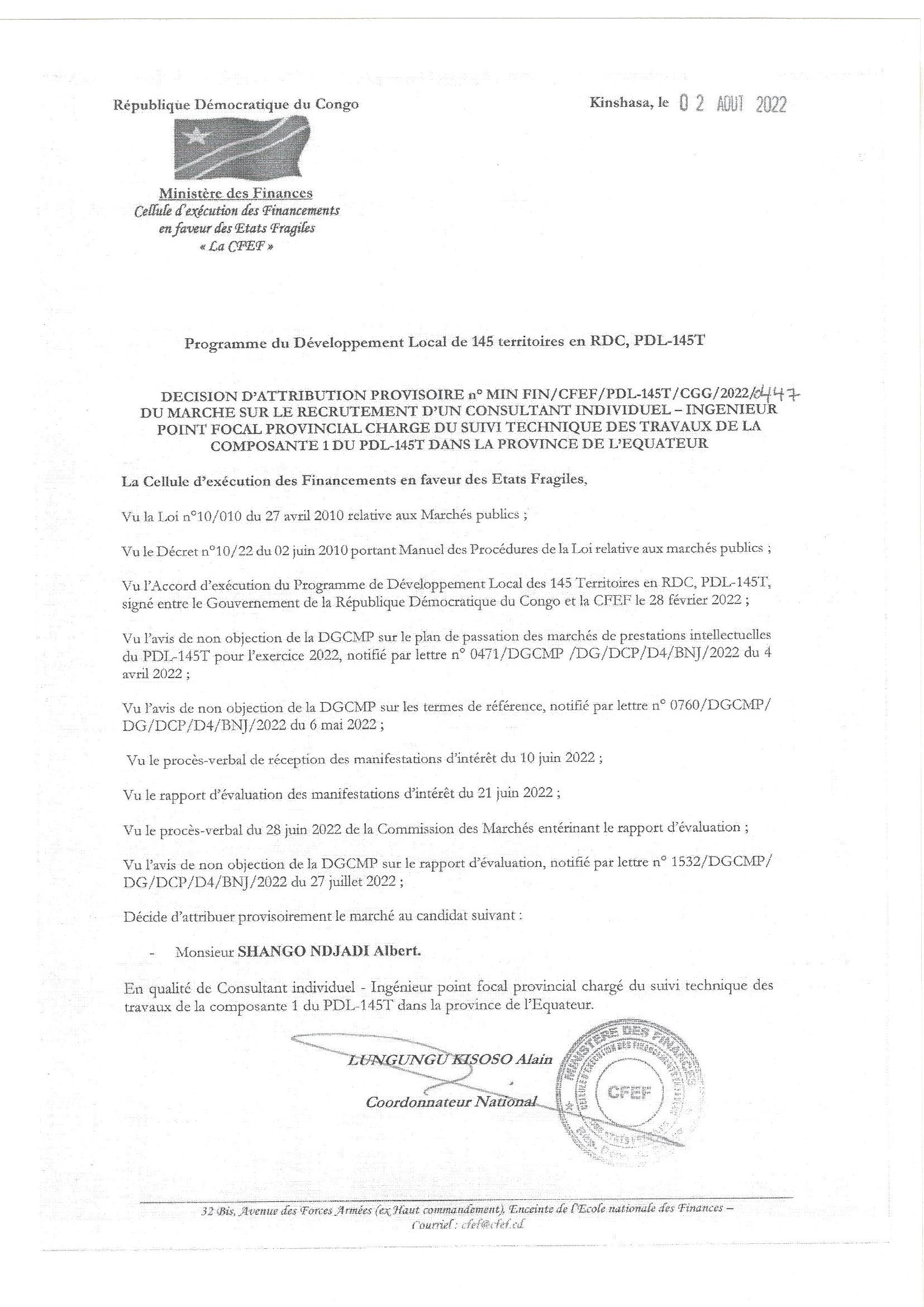 DECISION D’ATTRIBUTION PROVISOIRE D’UN CONSULTANT INDIVIDUEL ACCORDEE A Mr SHANGO NDJADI Albert EN QUALITE D’ UN INGENIEUR POINT FOCAL PROVINCIAL CHARGE DU SUIVI TECHNIQUE DES TRAVAUX DE LA COMPOSANTE 1 DU PDL-145T DANS LA PROVINCE DE L’EQUATEUR.