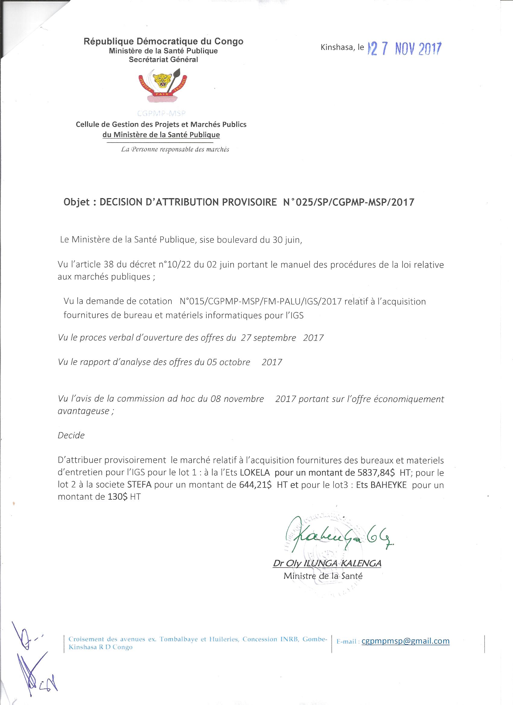 Décision d’attribution provisoire en faveur de l’Ets. Lokela pour le lot 1, la société stefa pour le lot 2 et l’Ets baheka pour le lot 3 du marché relatif à l’acquisition des fournitures des bureaux et matériels d’entretien pour l’IGS.