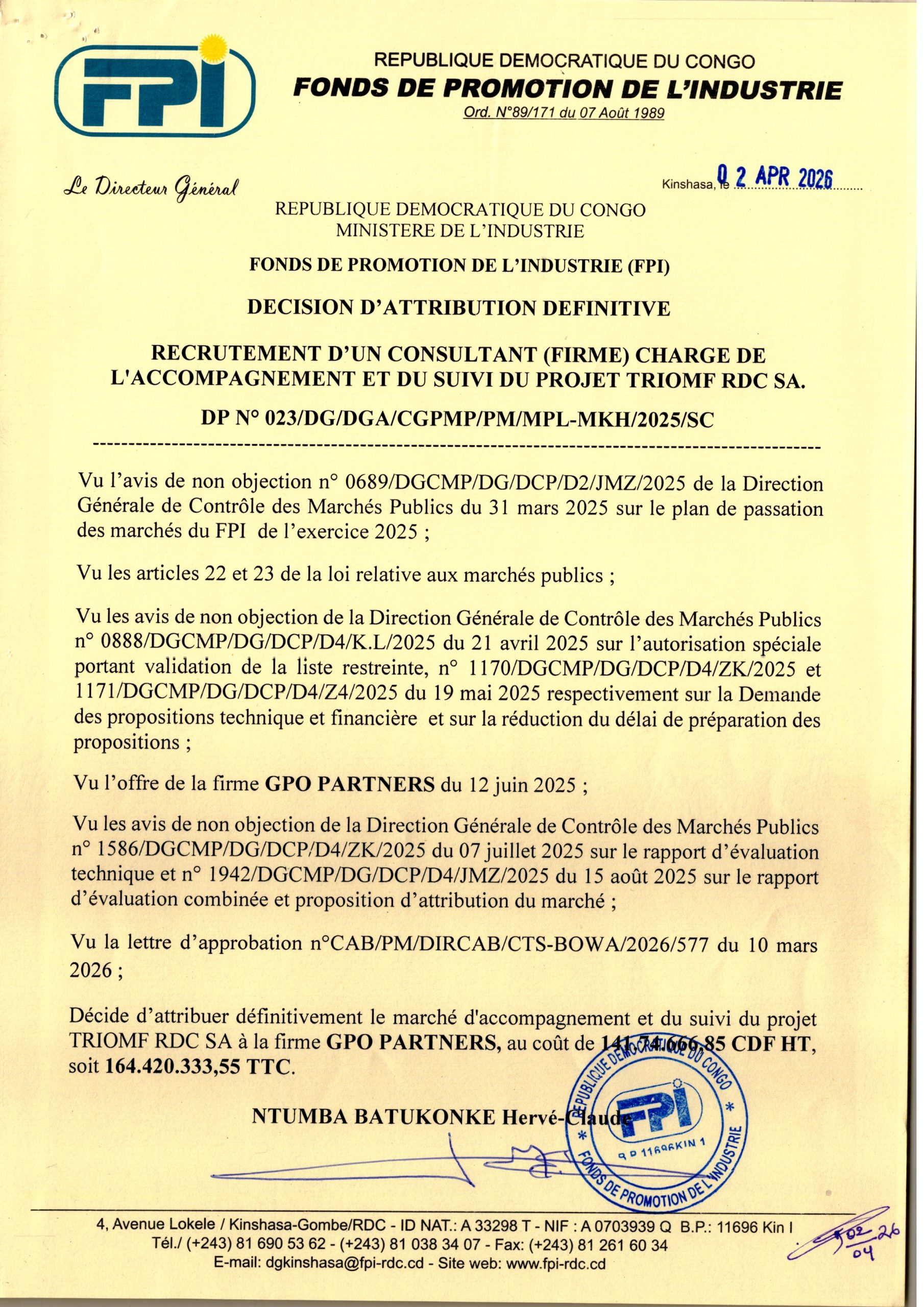 Décision d’attribution définitive accordée à la firme “GPO PARTNERS” relative au recrutement d’un consultant (firme) chargé de l’accompagnement et du suivi du projet TRIOMF RDC SA.