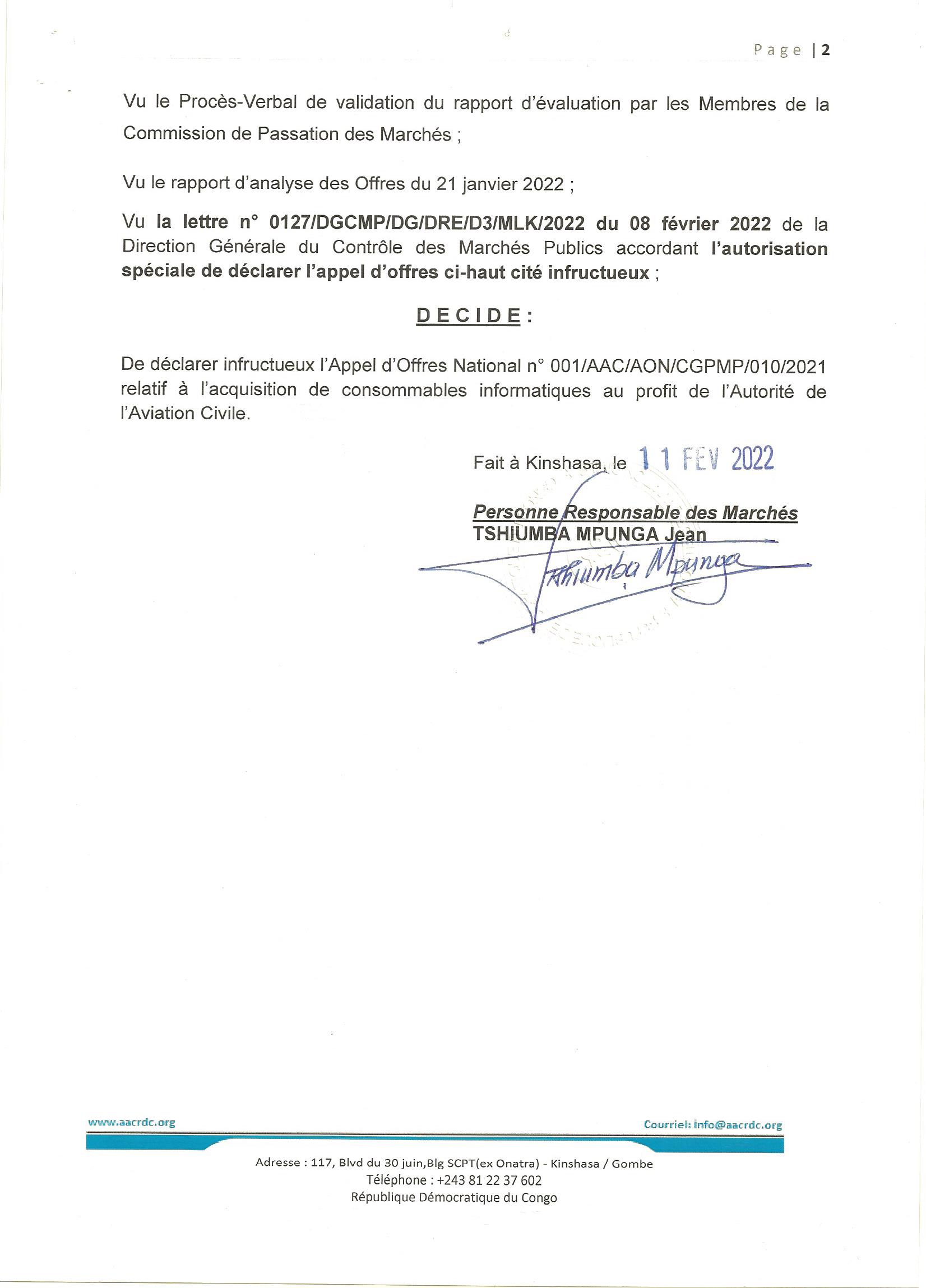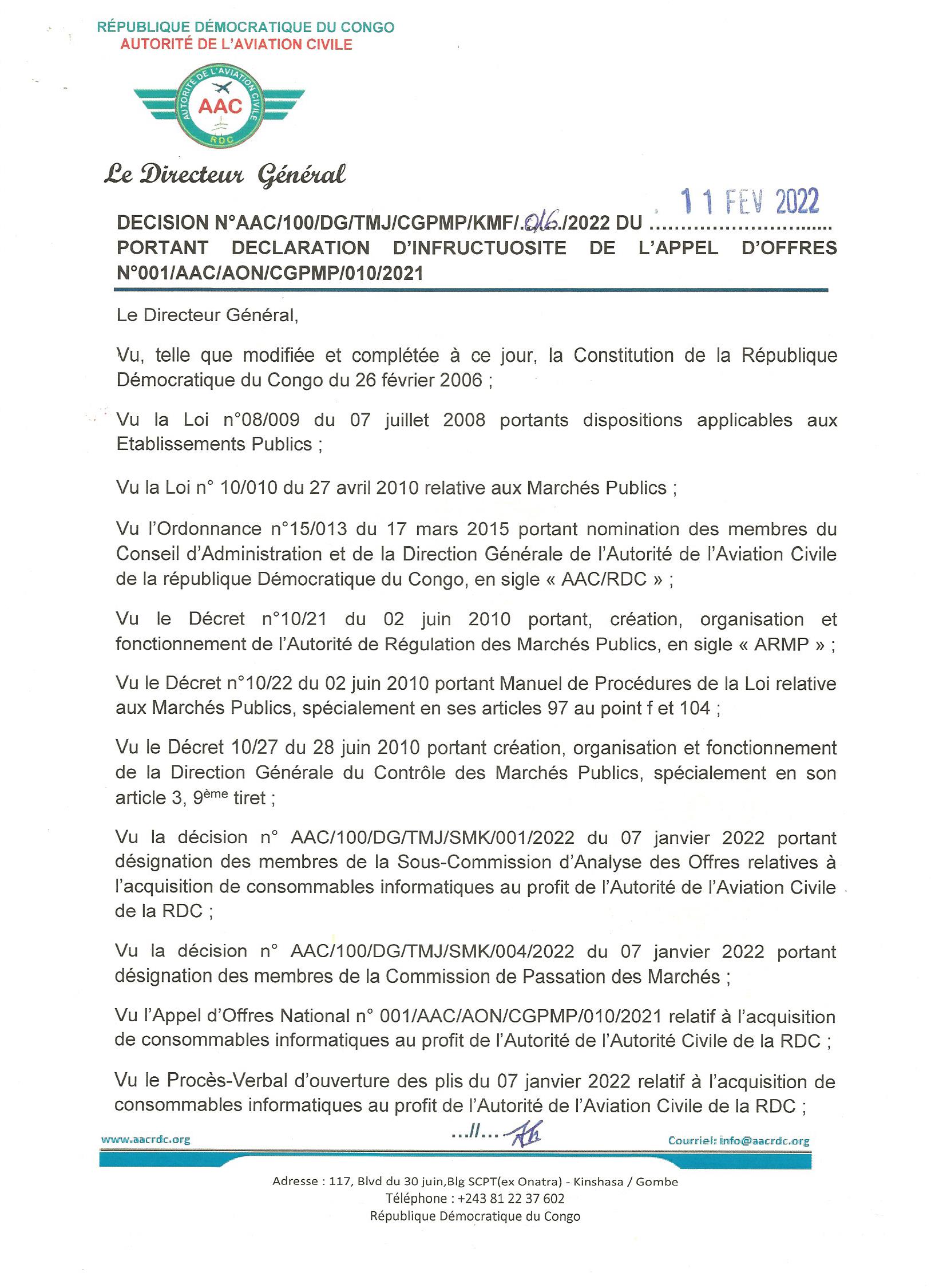 Décision portant déclaration d’infructuosité de l’appel d’offres du marché relatif à l’acquisition de consommables informatiques.