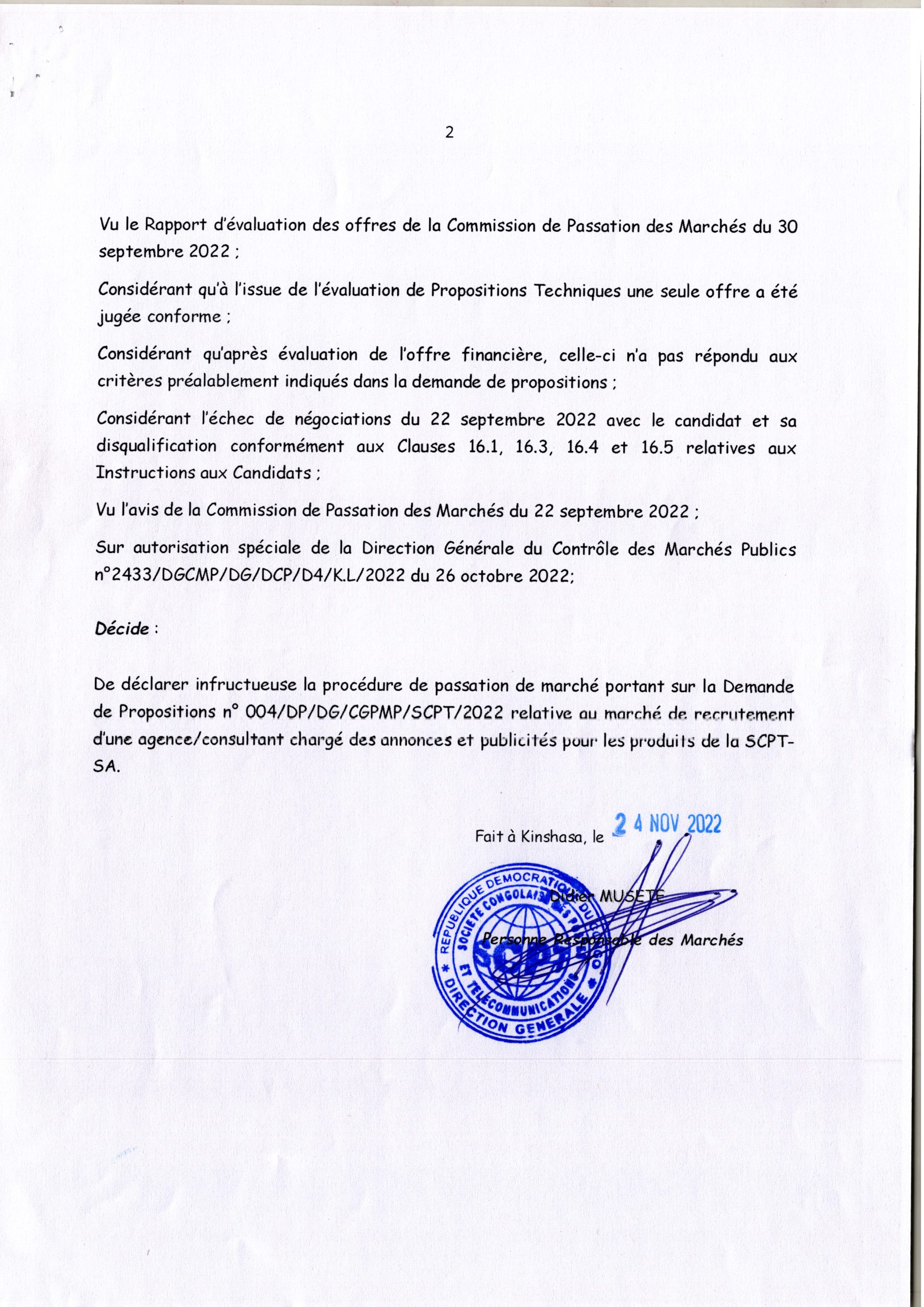Décision portant déclaration d’infructuosité relative au Recrutement d’un cabinet/consultant chargé des annonces et publicités pour les produits de la SCTP-SA