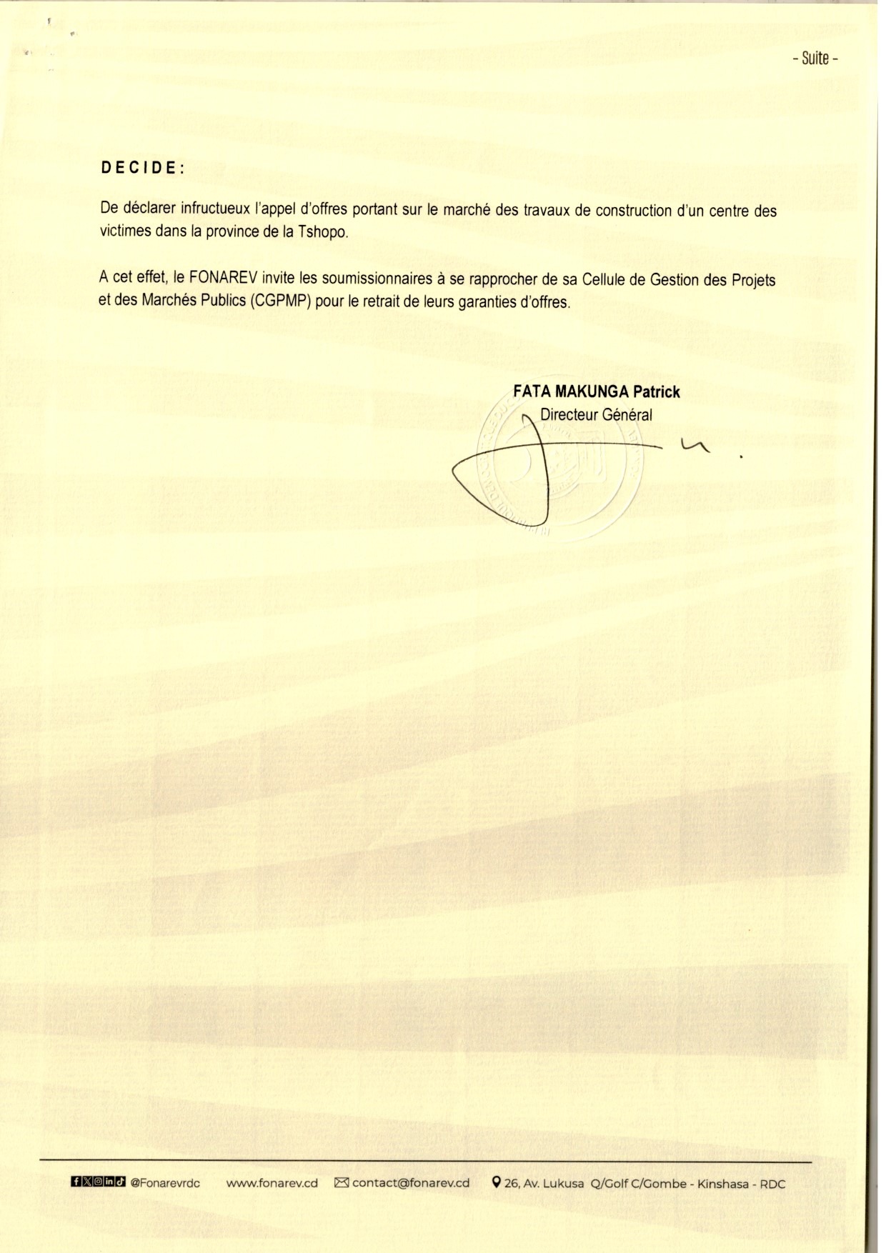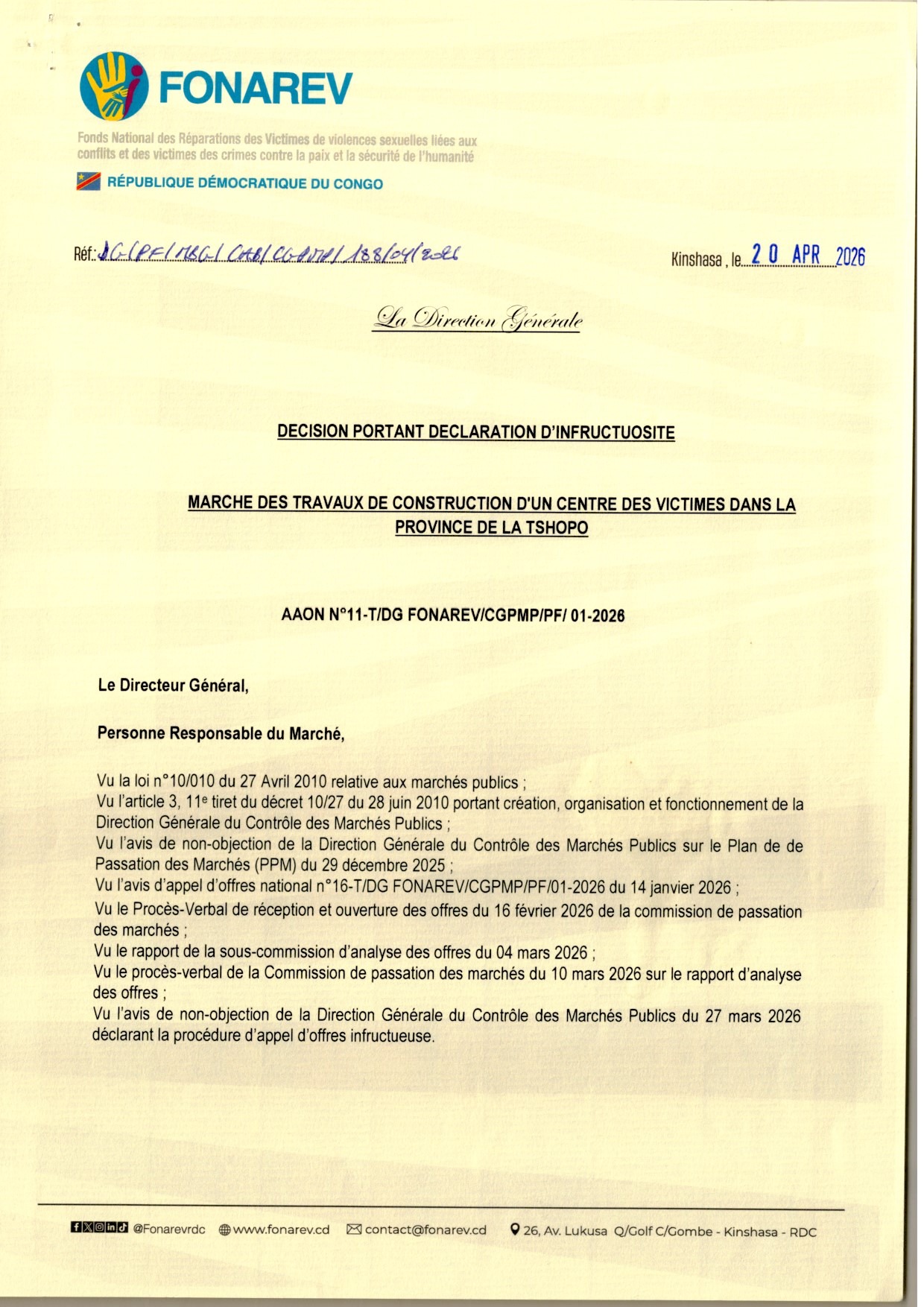 Décision portant déclaration d’Infructuosité relative aux Travaux de construction d’un Centre des Visites dans la Province de la Tshopo.