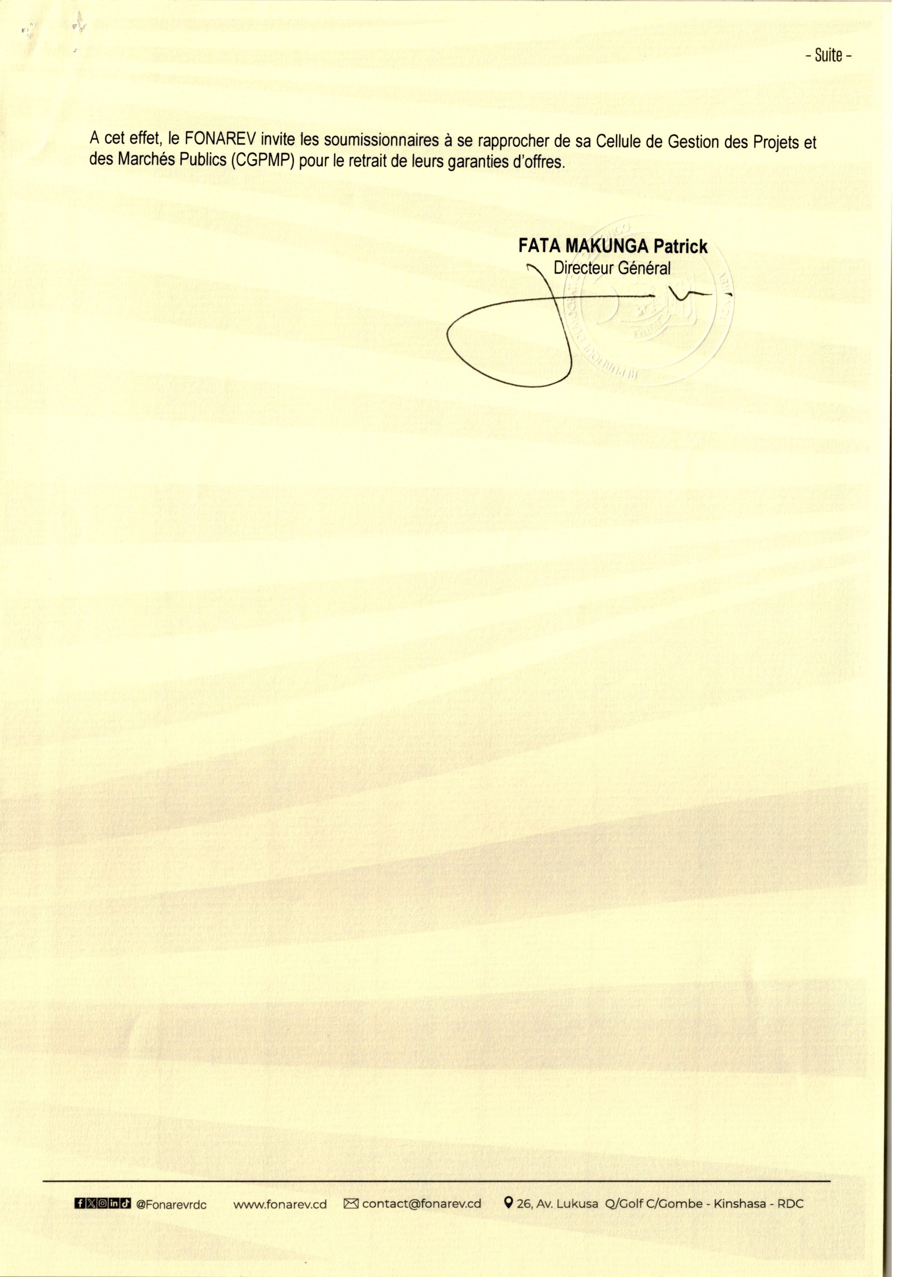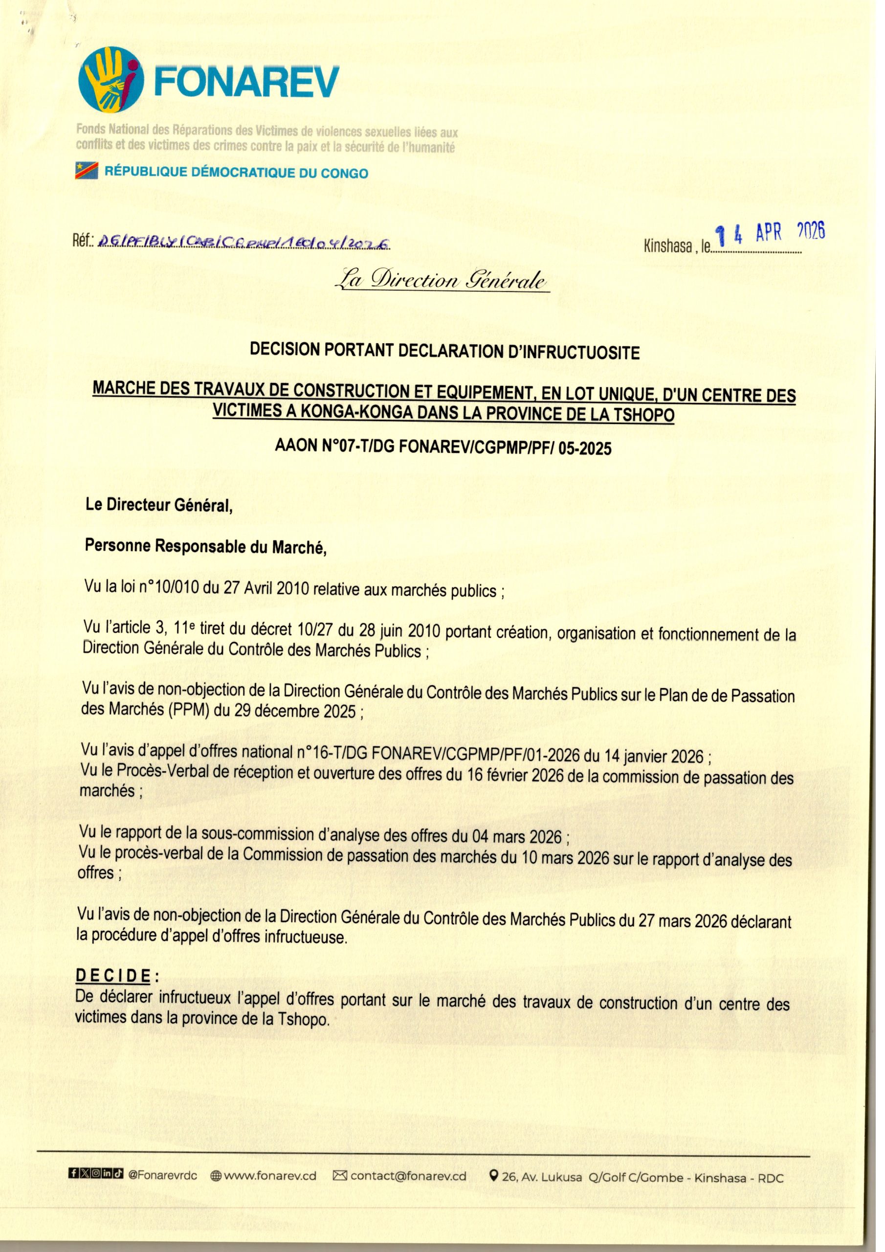 Décision portant déclaration d’infructuosité relative aux travaux de construction et équipement en lot unique d’un centre des victimes à KONGA-KONGA dans la Province de la TSHOPO.