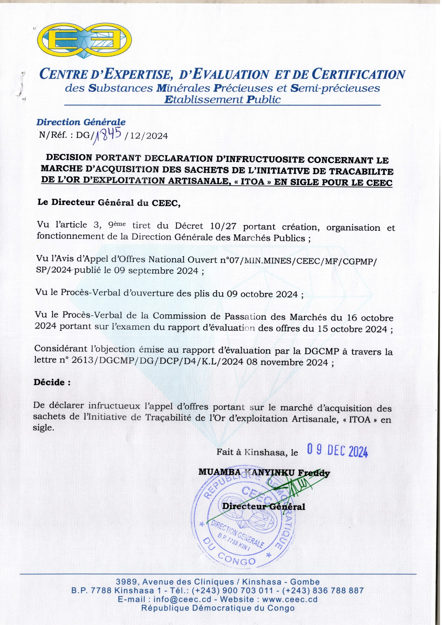 Déclaration d’infructuosité concernant le marché d’acquisition des sachets de l’initiative de traçabilité de l’or d’exploitation artisanale, “ITOA” en sigle pour le CEEC.