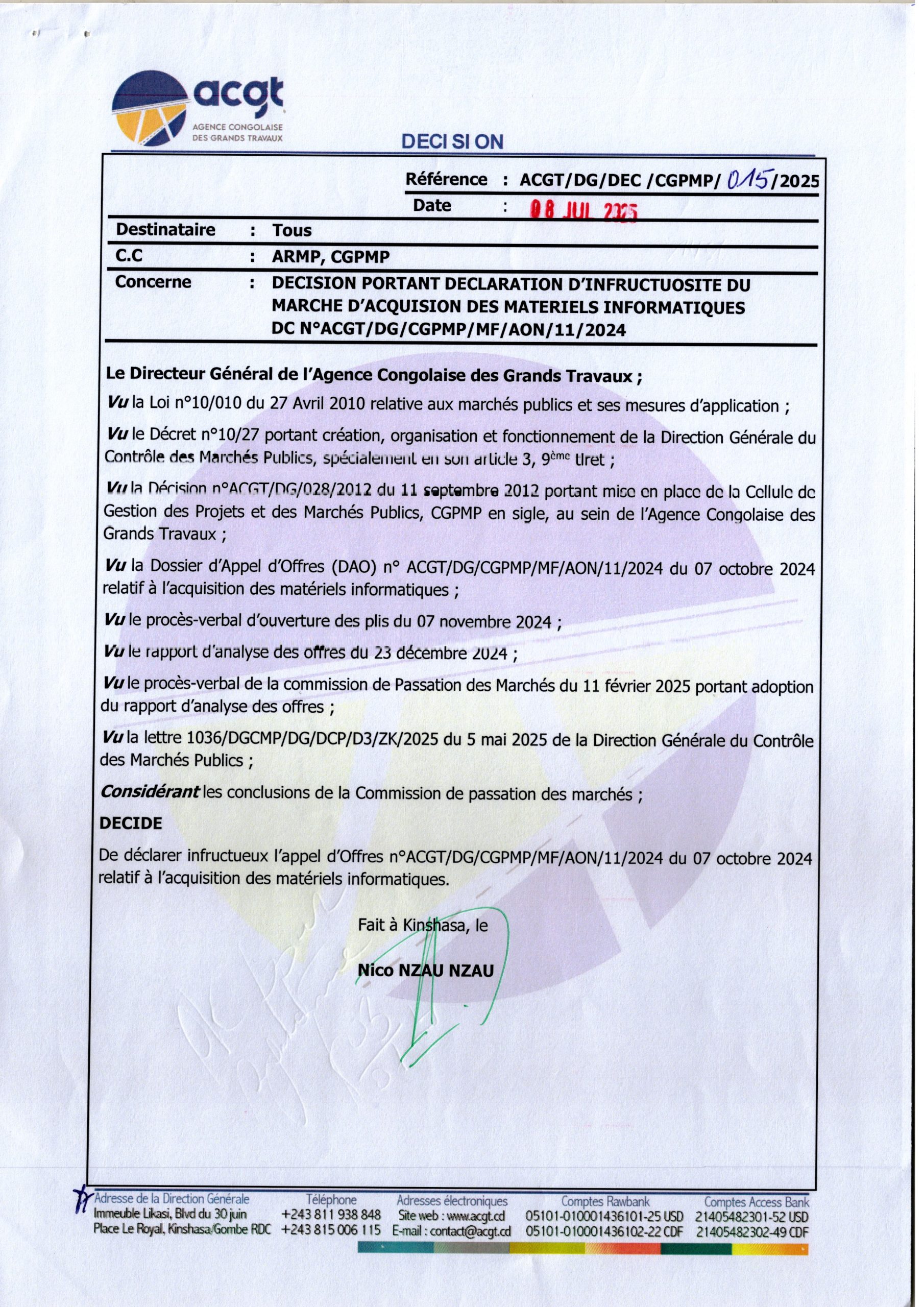 Declaration d’infructuosité relatif au marché d’acquisition des matériels informatiques.