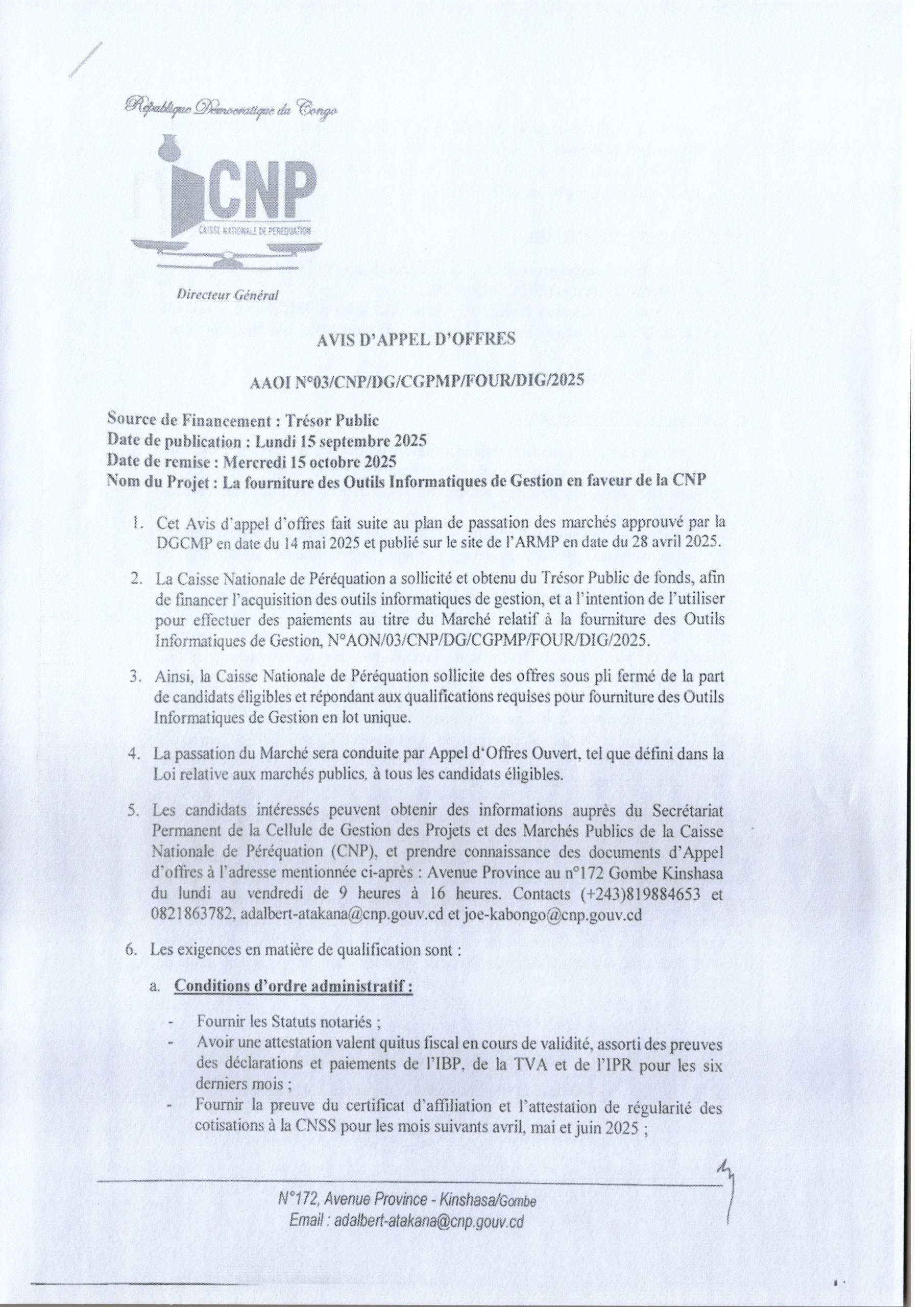 Fourniture des outils informatiques de gestion en faveur de la CNP.