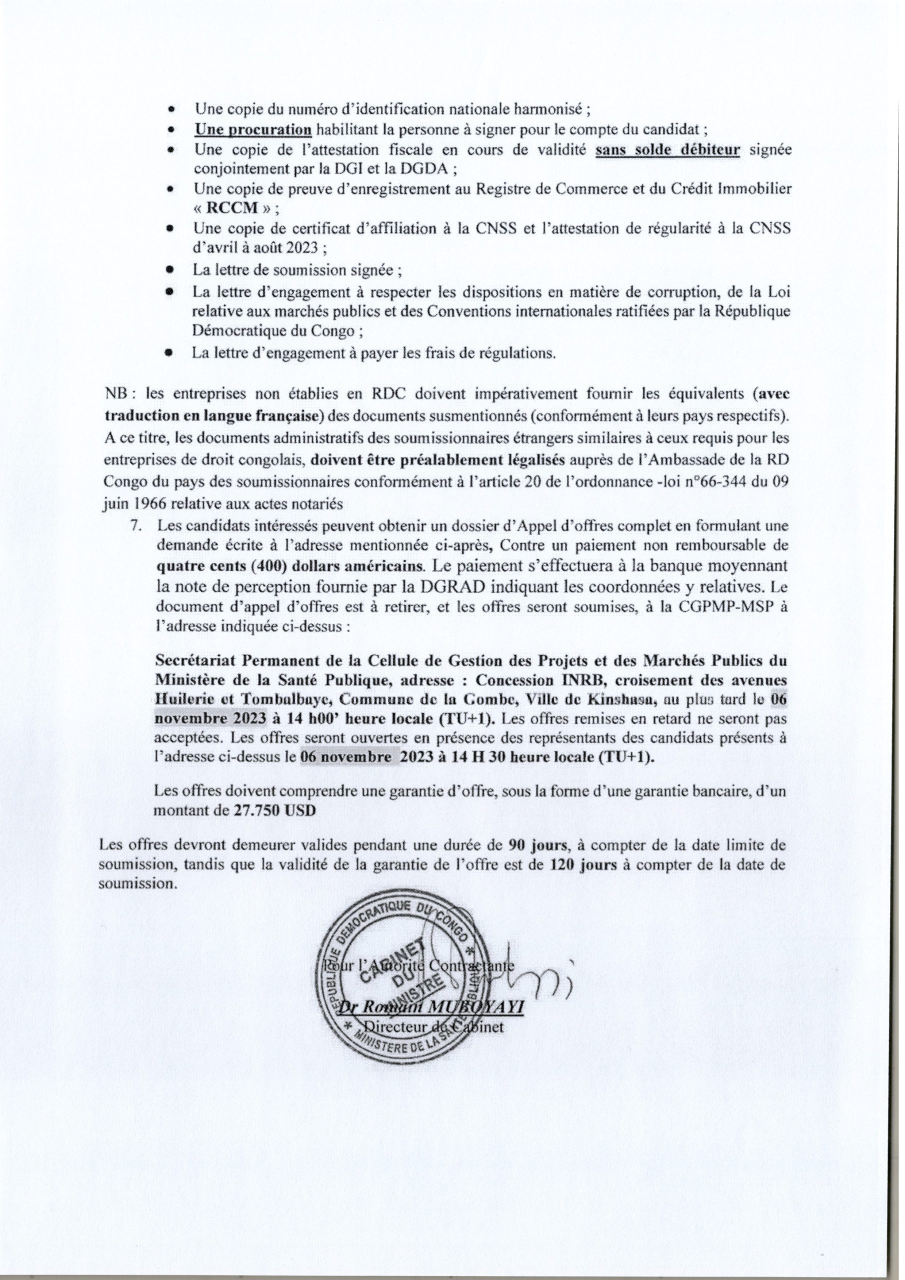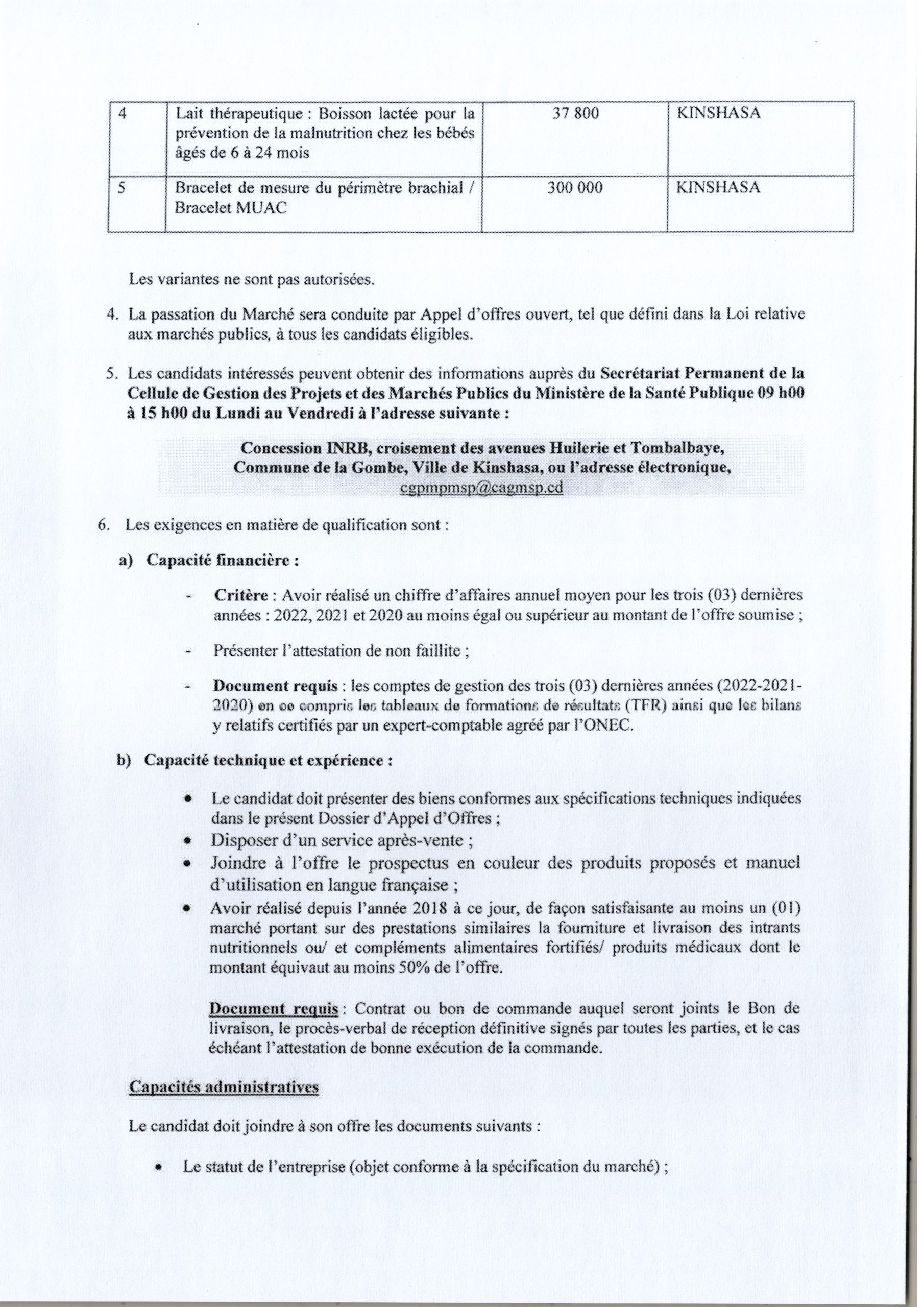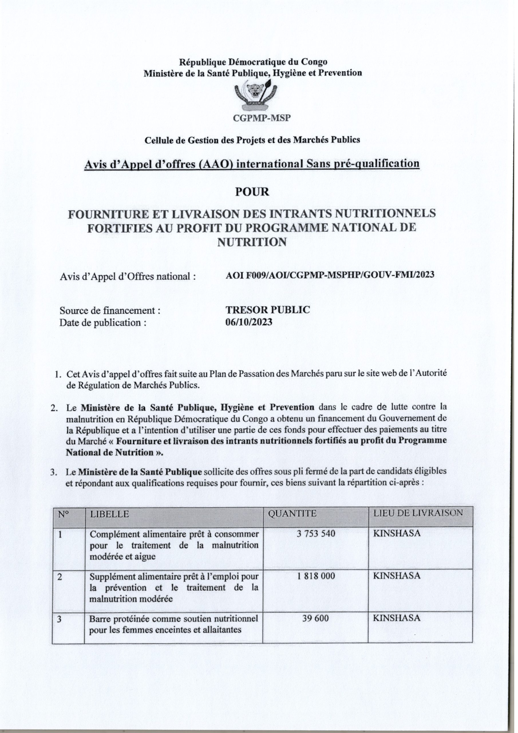 Fourniture et livraison des intrants nutritionnels Fortifies au profit du programme national de Nutrition.