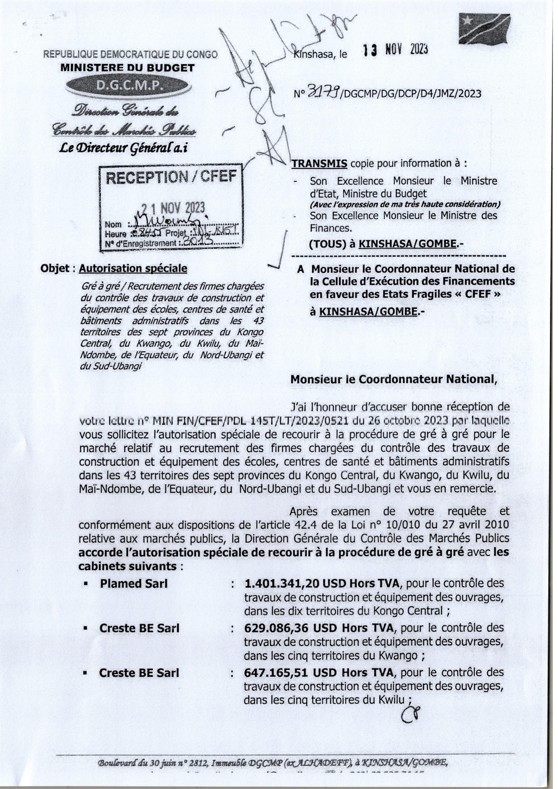 Gré à Gré / Recrutement des firmes chargées du contrôle des travaux de construction et équipement des écoles, centres de santé et bâtiments administratifs dans les 43 territoires des sept provinces du Kongo Central, du Kwango, du Kwilu,…