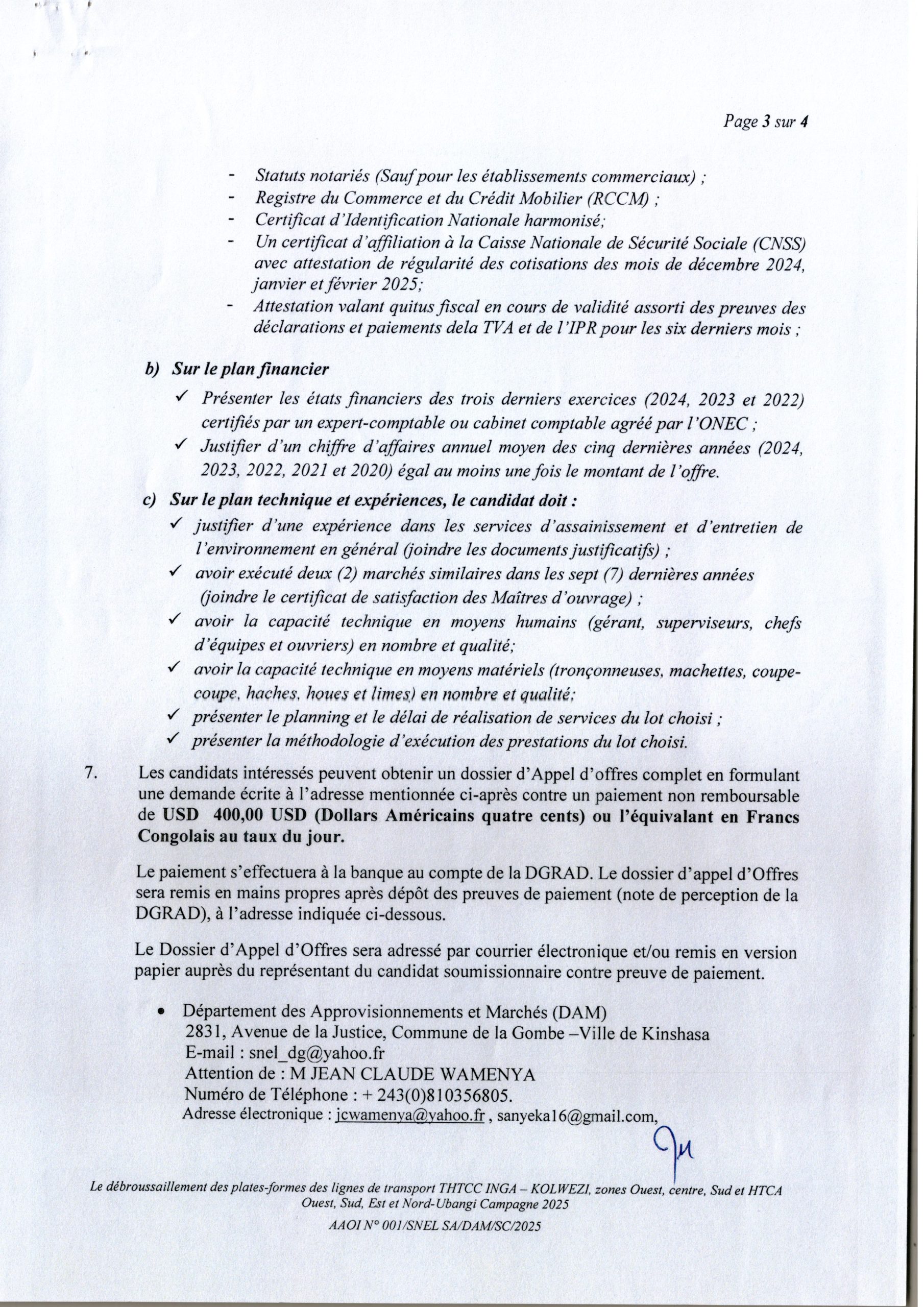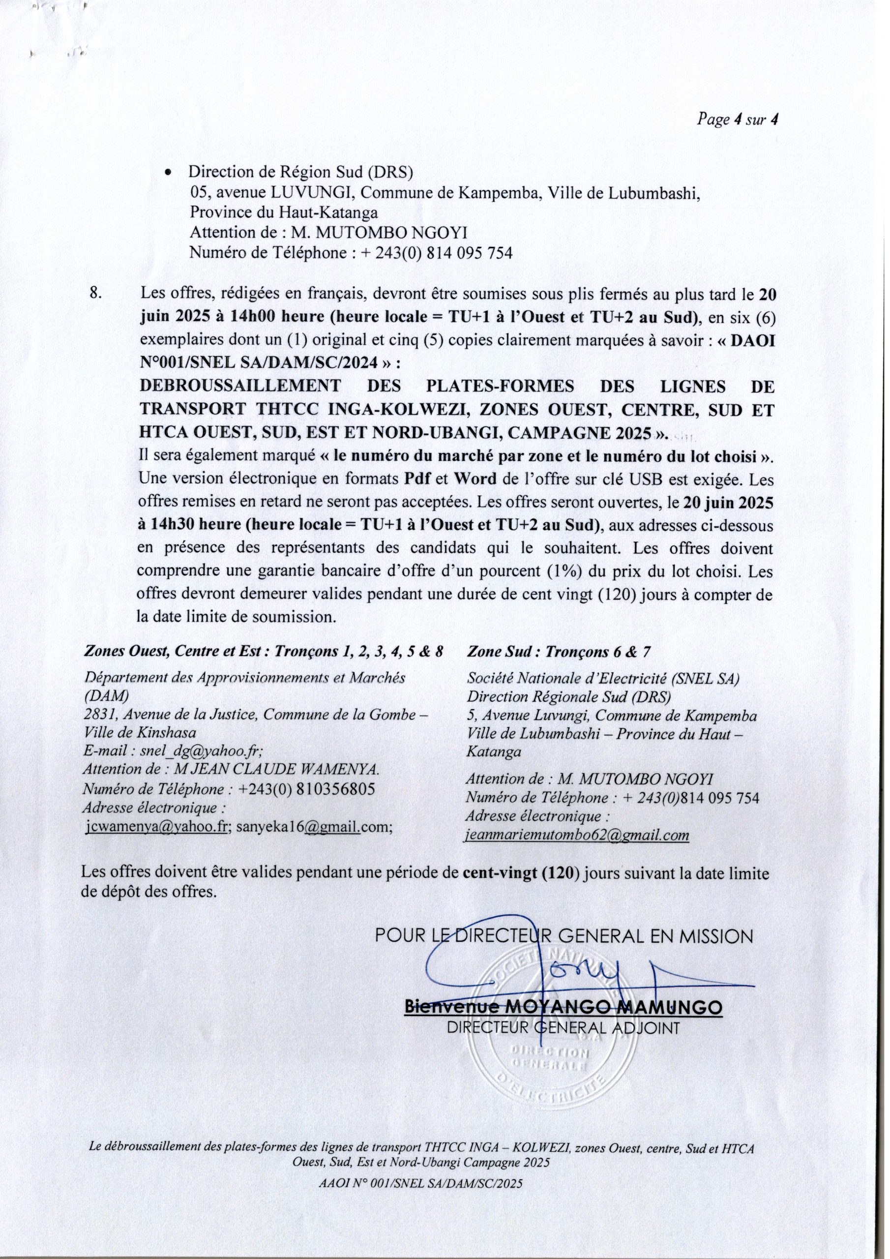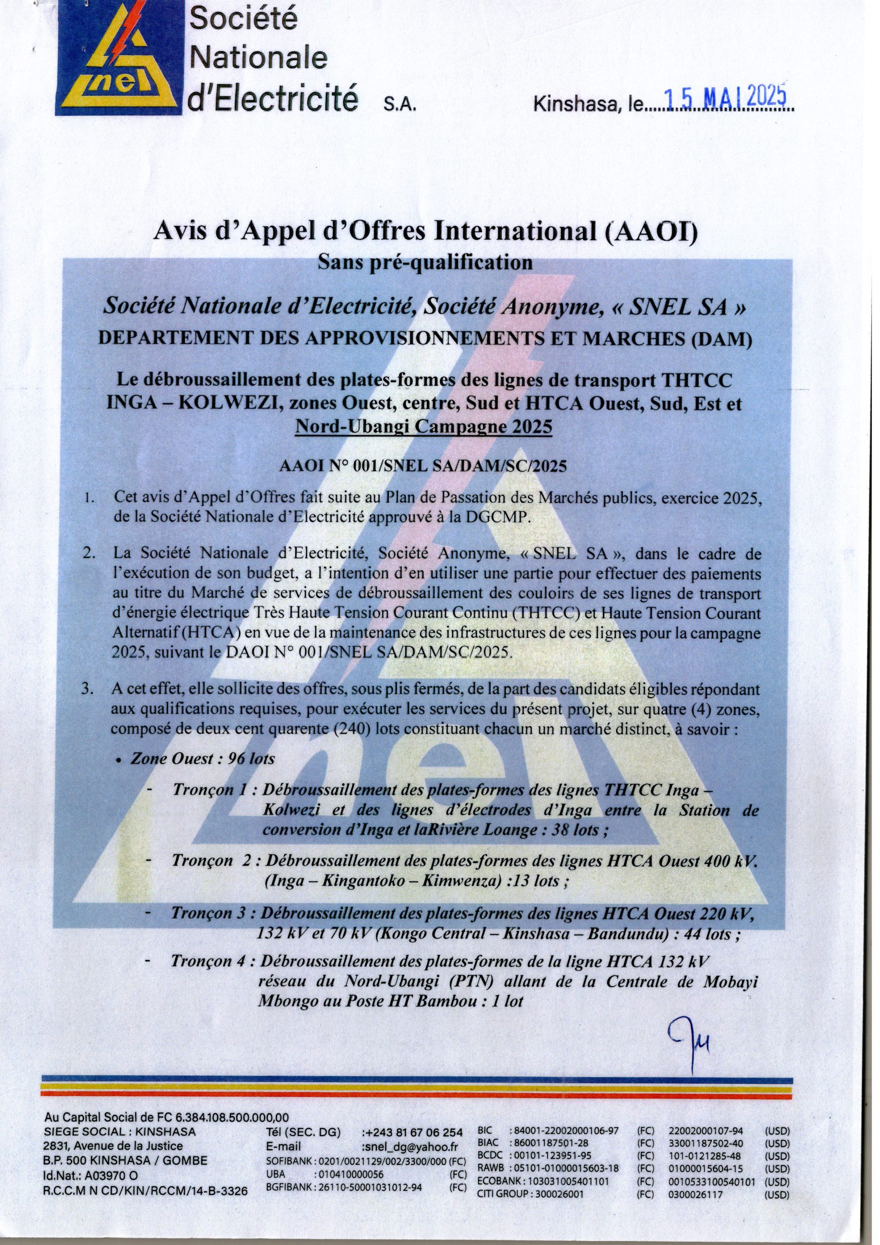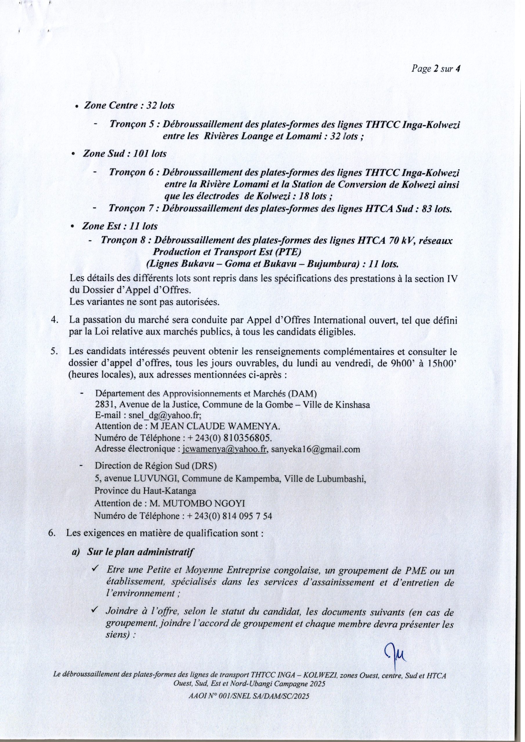 Le débroussaillement des plates-formes des lignes de transport THTCC INGA-KOLWEZI, zones Ouest, centre, Sud et HTCA Ouest, Sud, Est et Nord-Ubangi Campagne 2025.