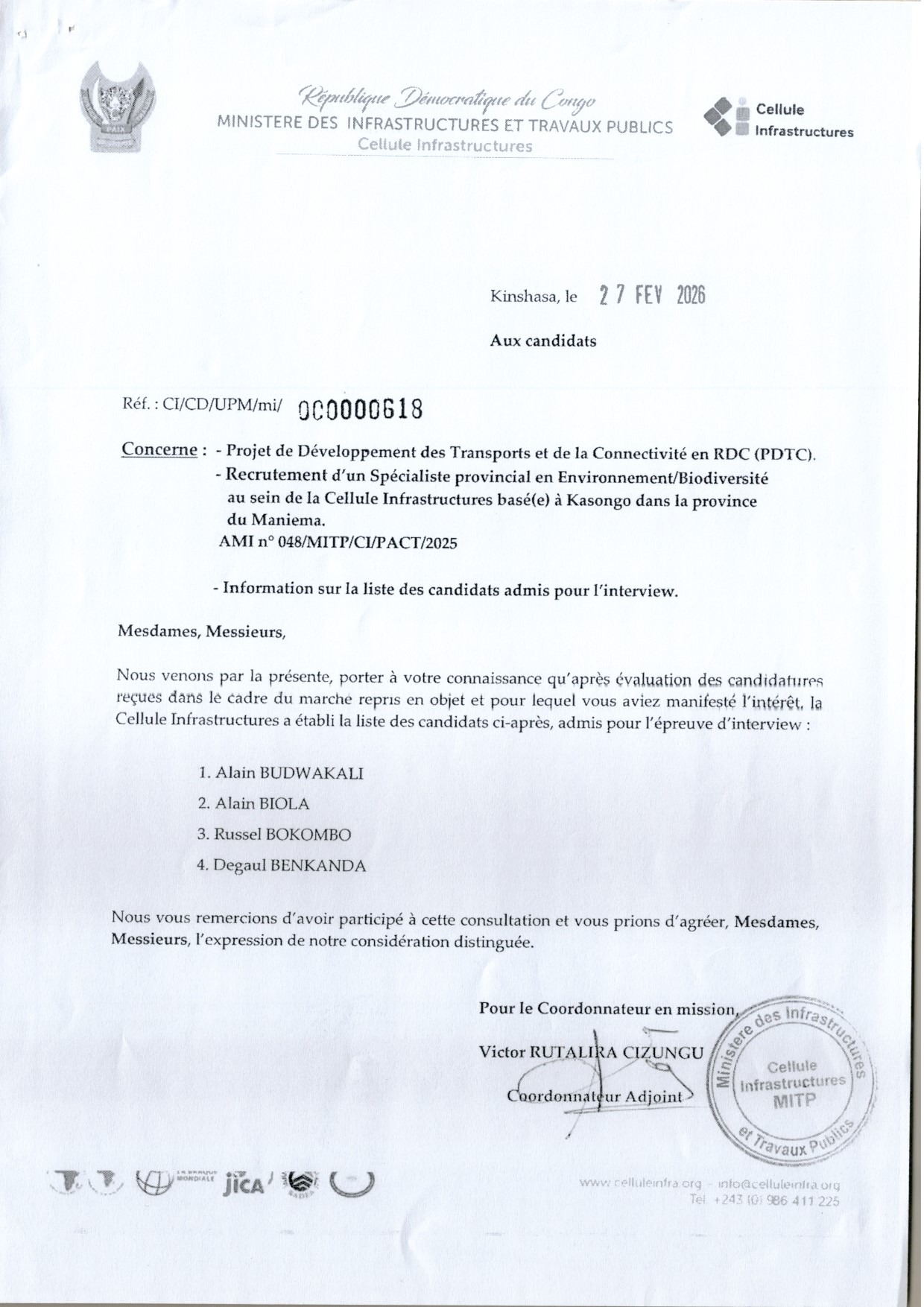 Liste des candidats retenus pour l’épreuve d’interview recrutement d’un spécialiste provincial en Environnement /Biodiversité au sein de la cellule Infrastructures basé(e)à Kasongo dans la province de Maniema.