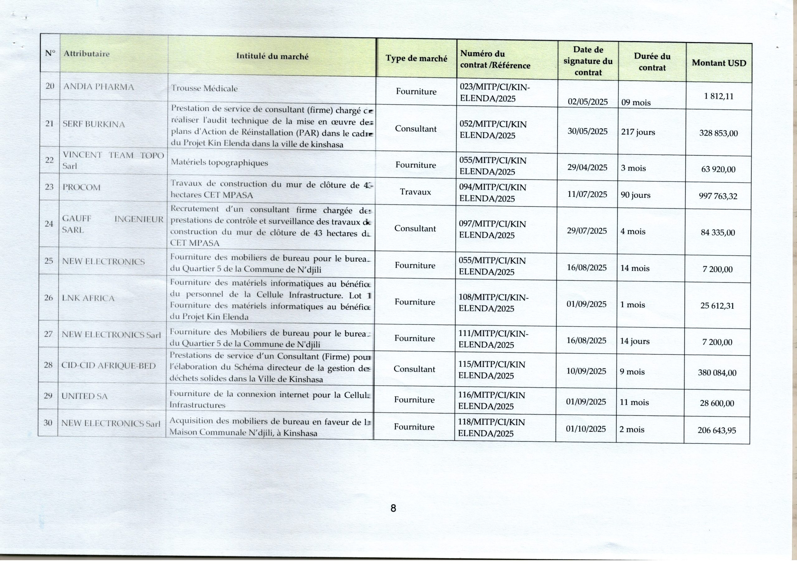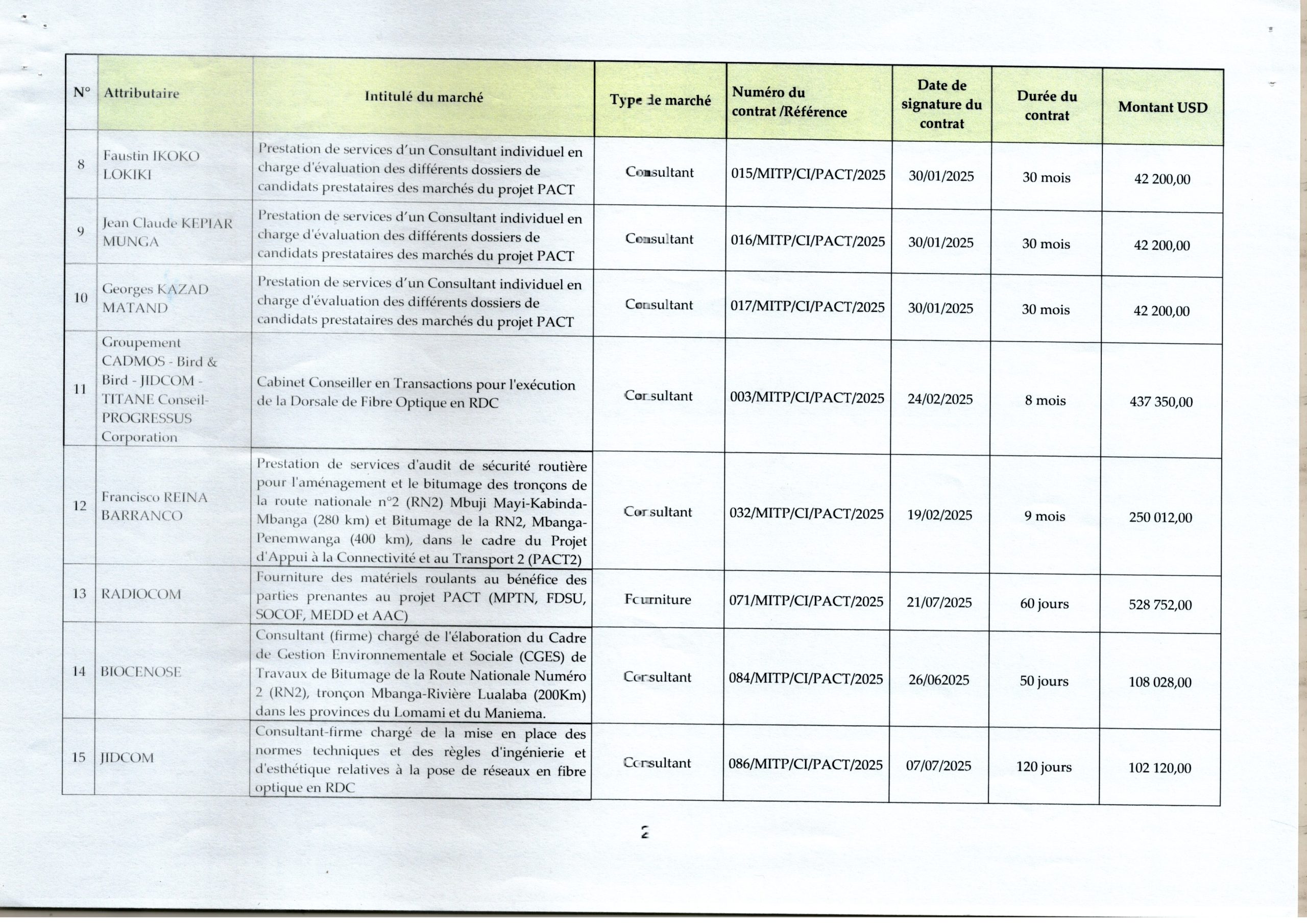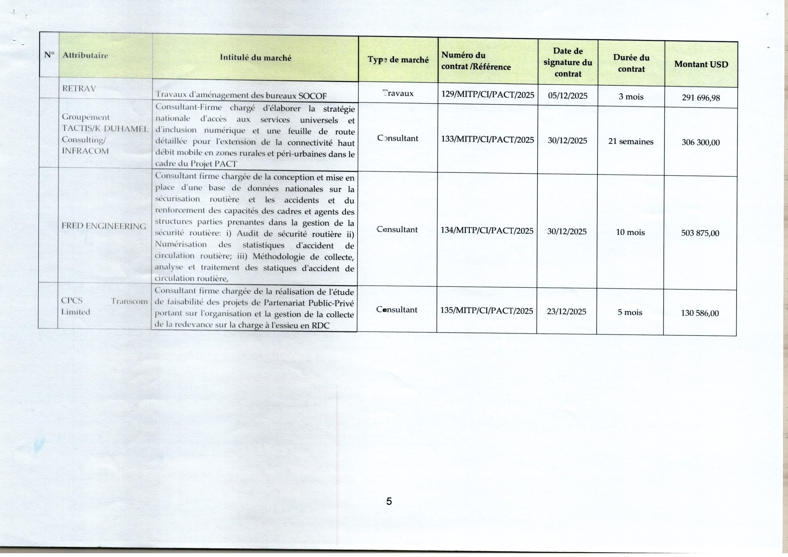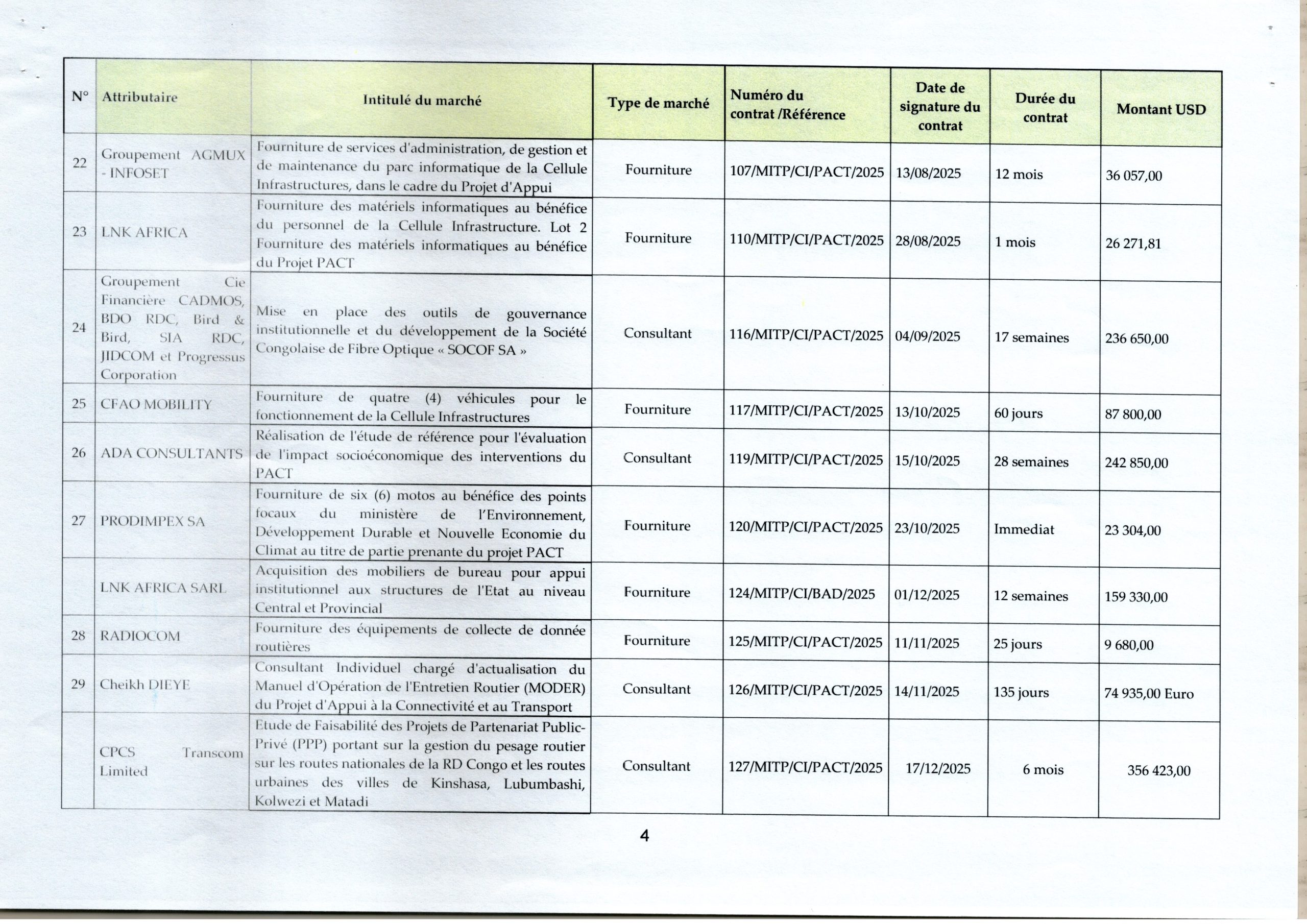 Liste des marchés signés à la Cellule Infrastructure en 2025