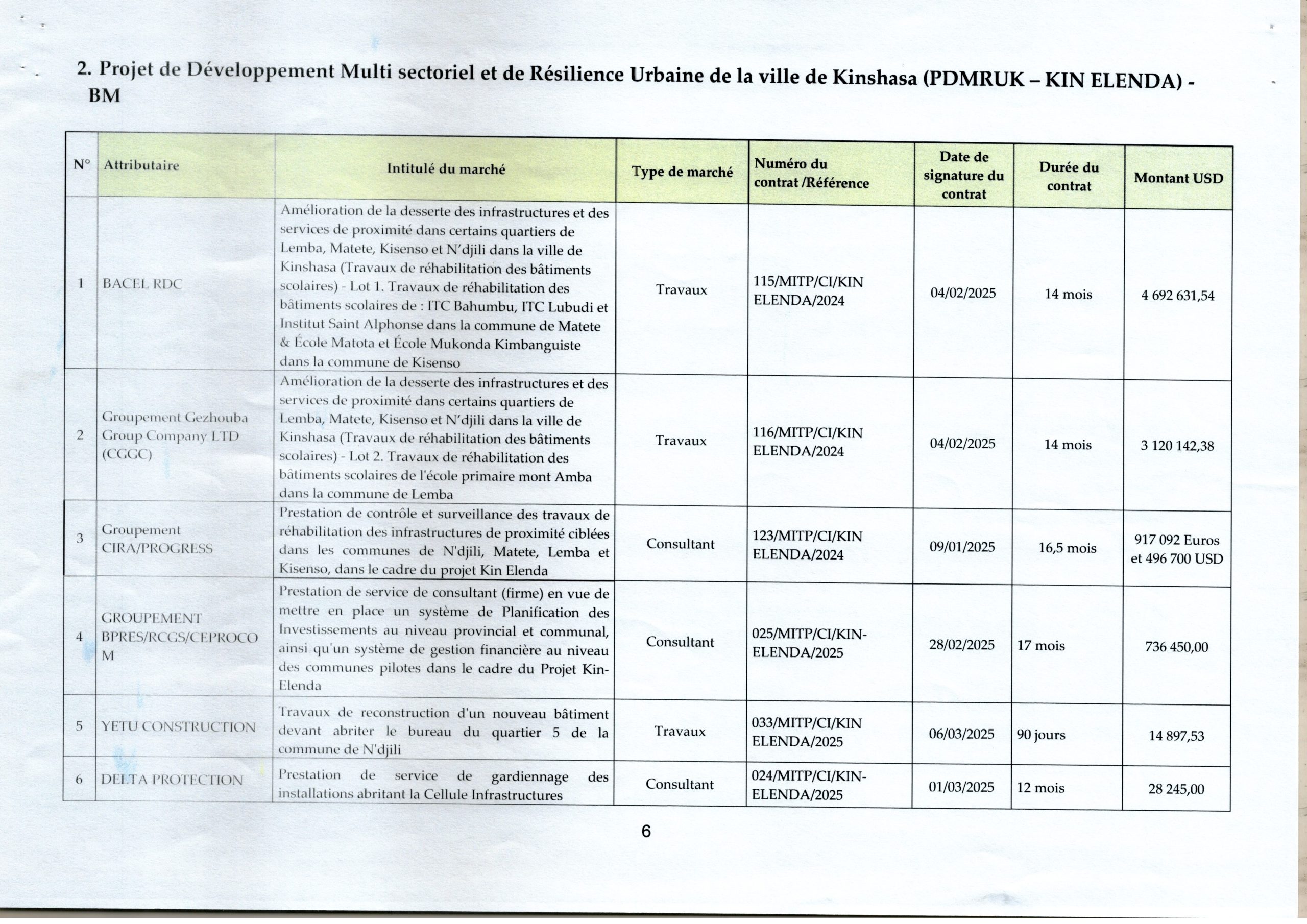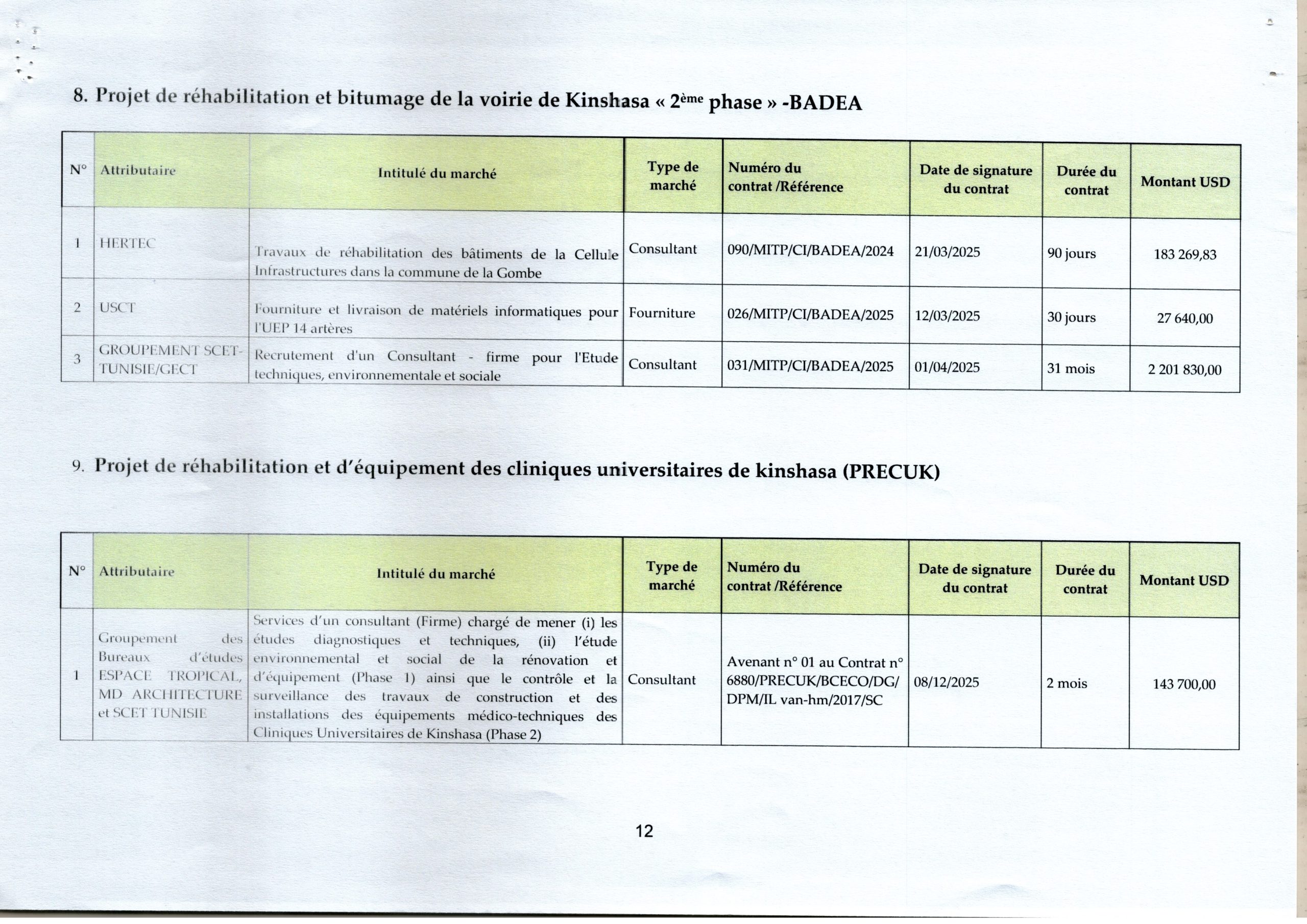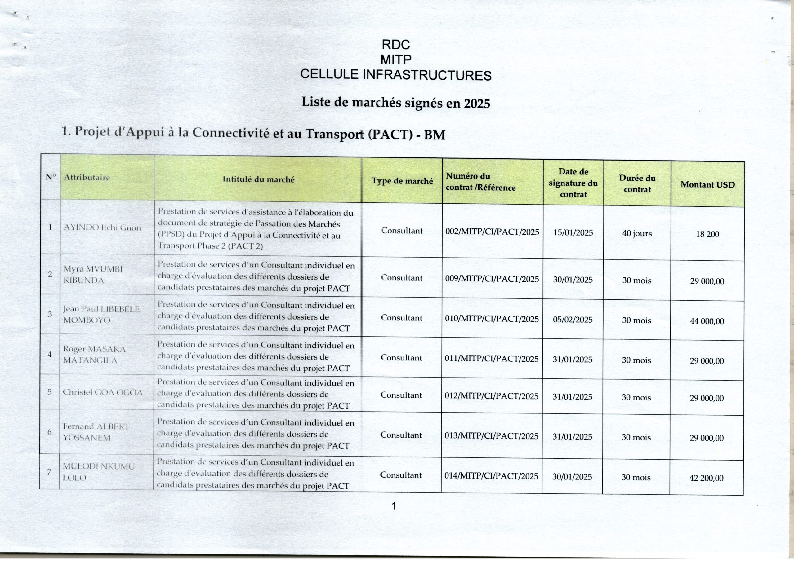 Liste des marchés signés à la Cellule Infrastructure en 2025