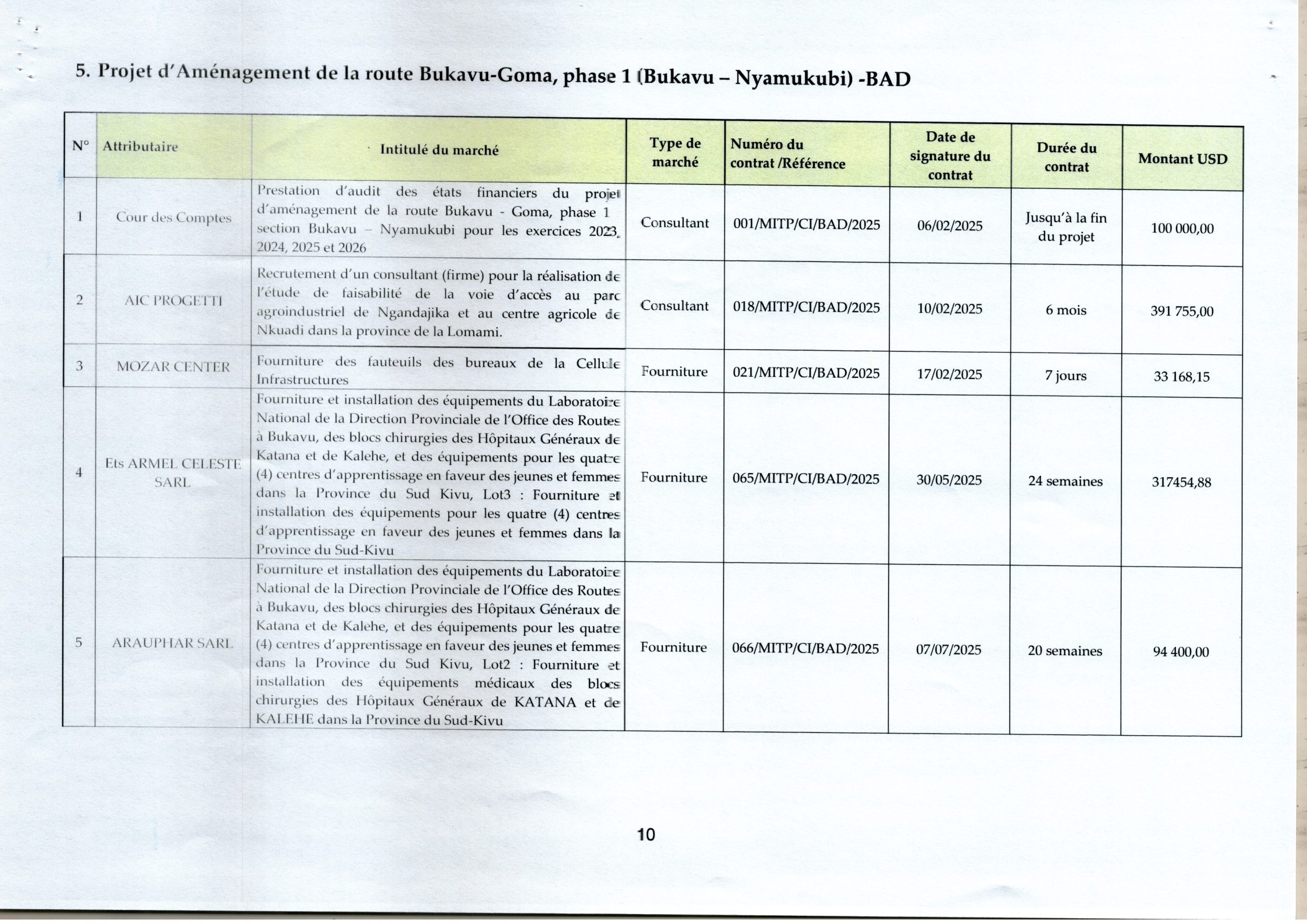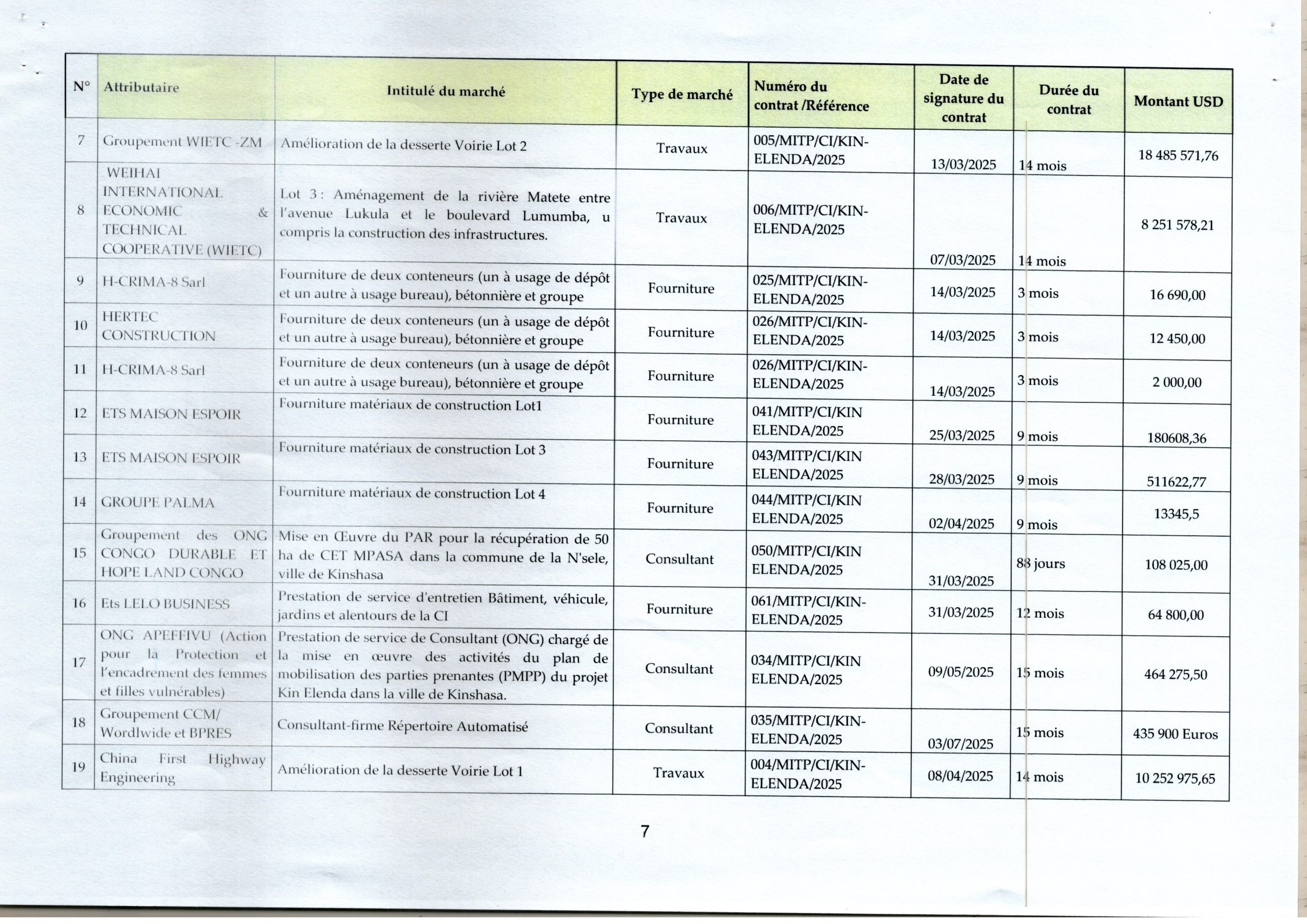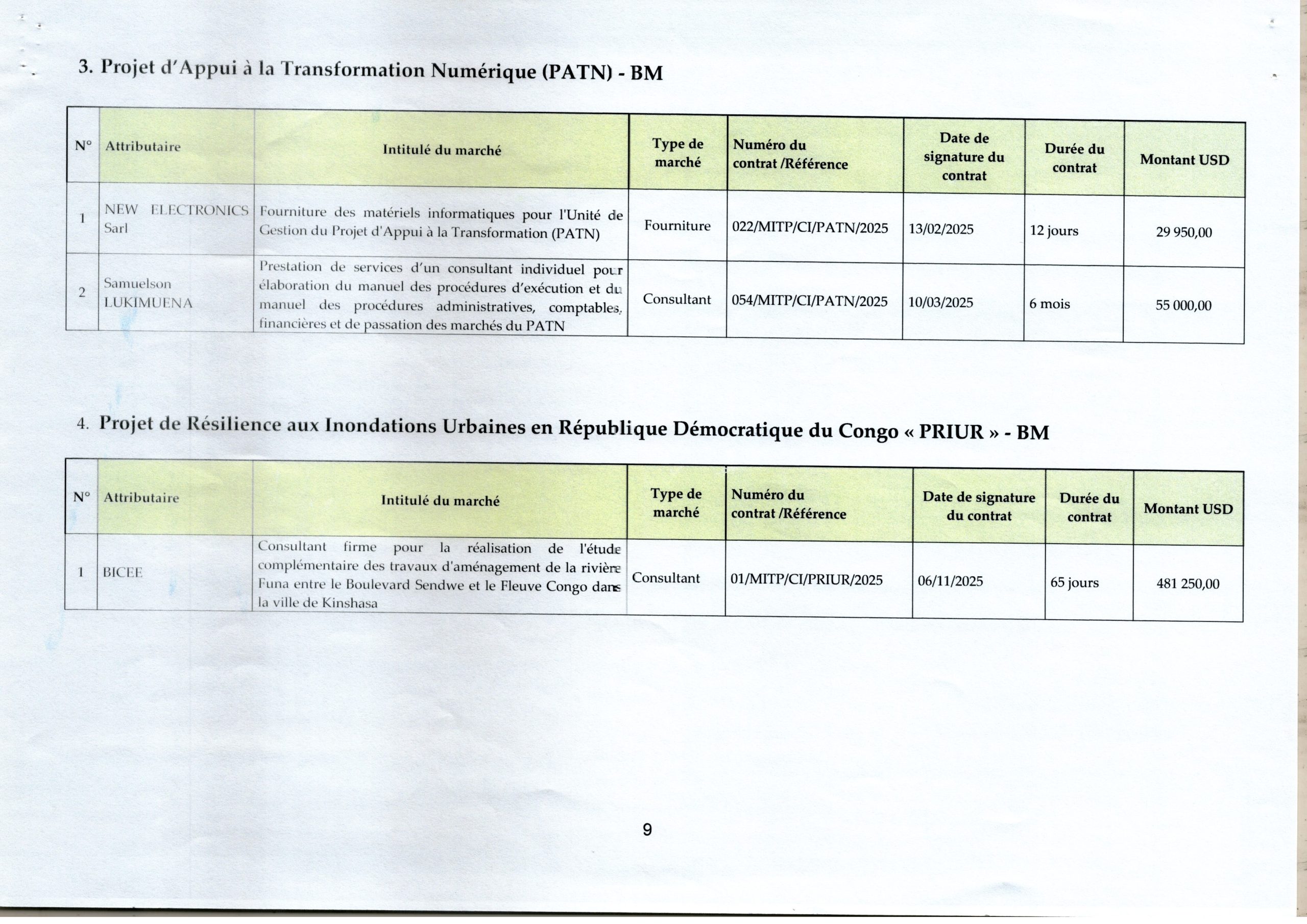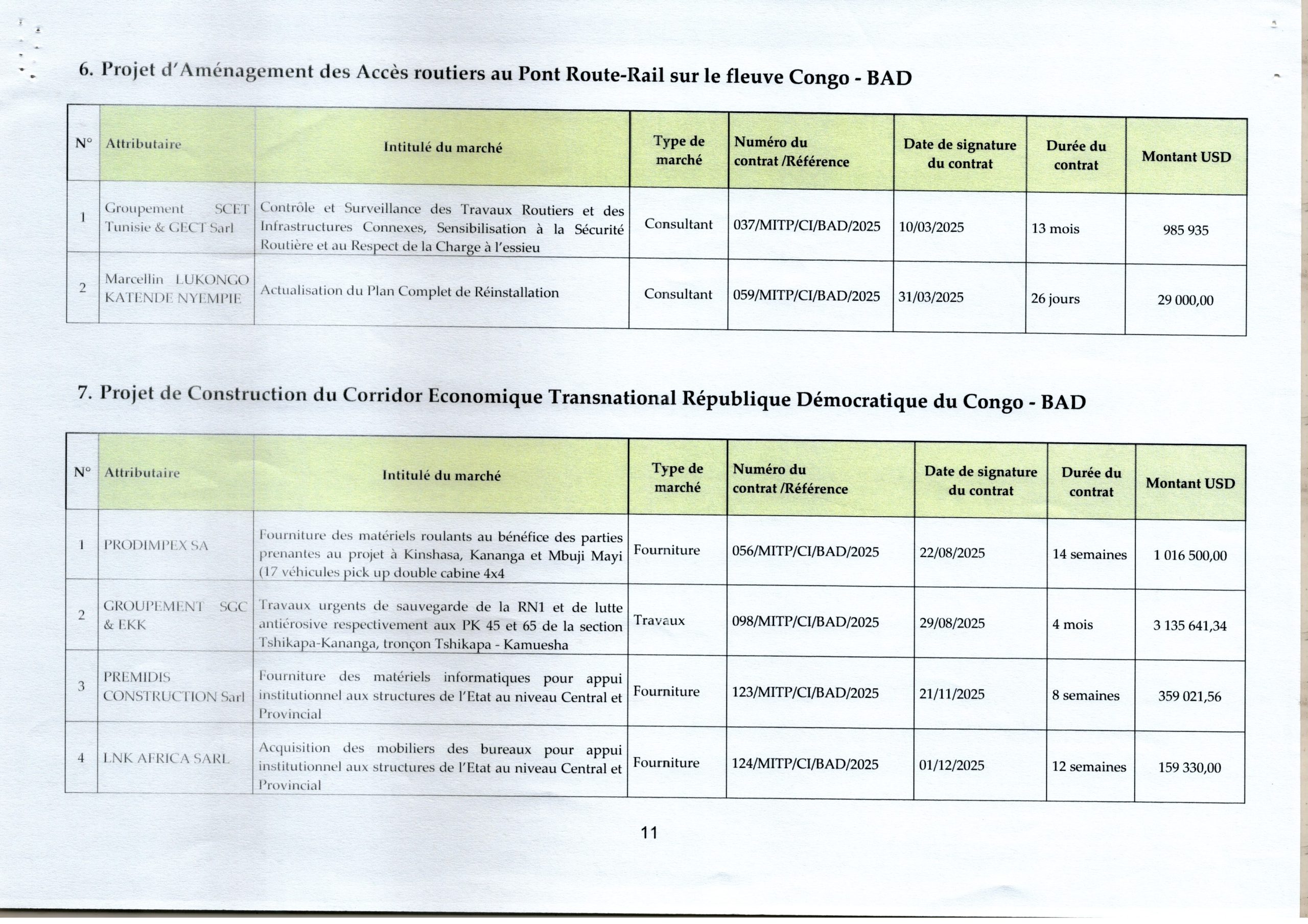 Liste des marchés signés à la Cellule Infrastructure en 2025