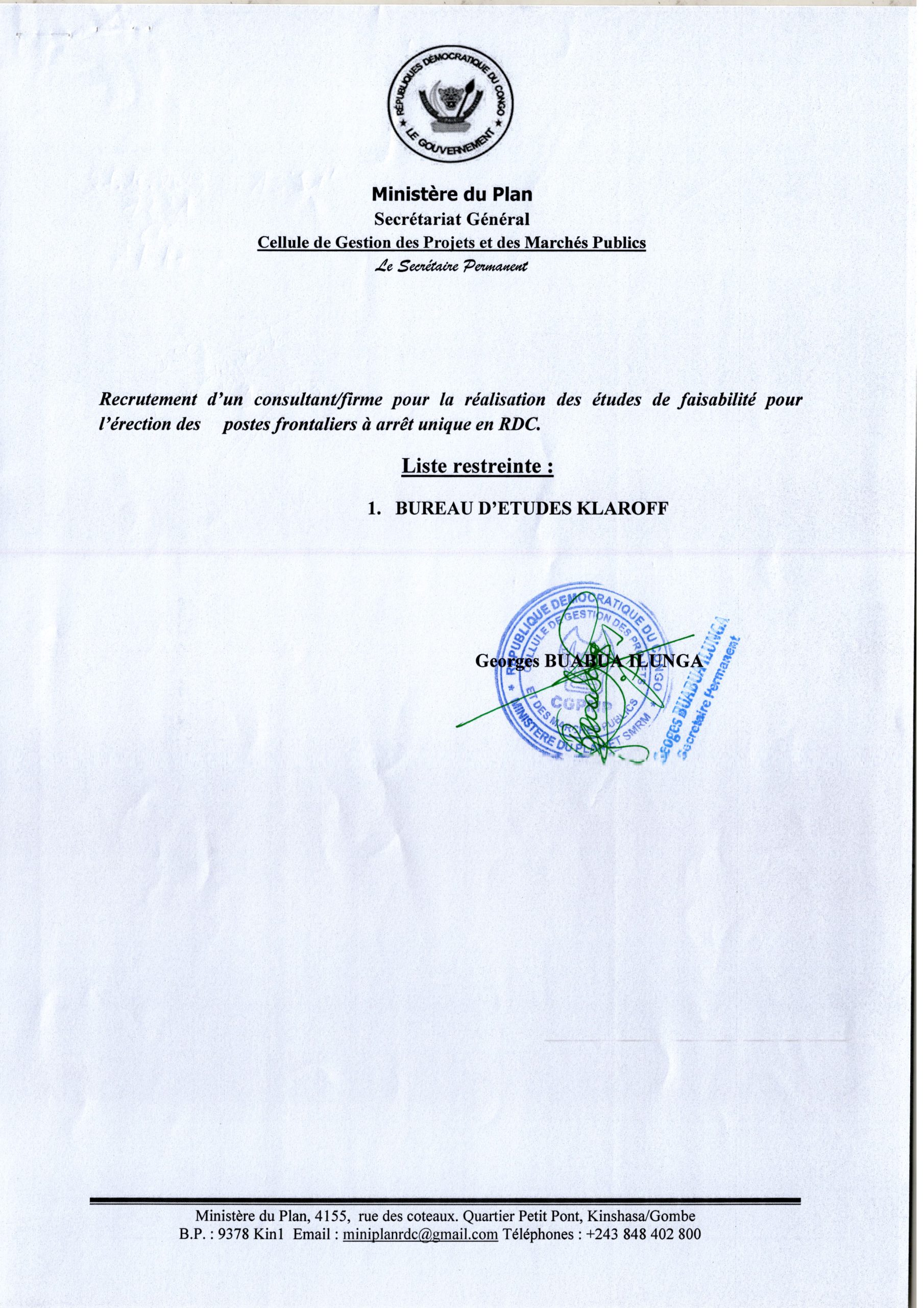 Liste restreint du Ministère du Plan relatif au Recrutement d’un consultant/firme pour la réalisation des études de faisabilité pour l’érection des postes frontaliers à arrêt unique en RDC.