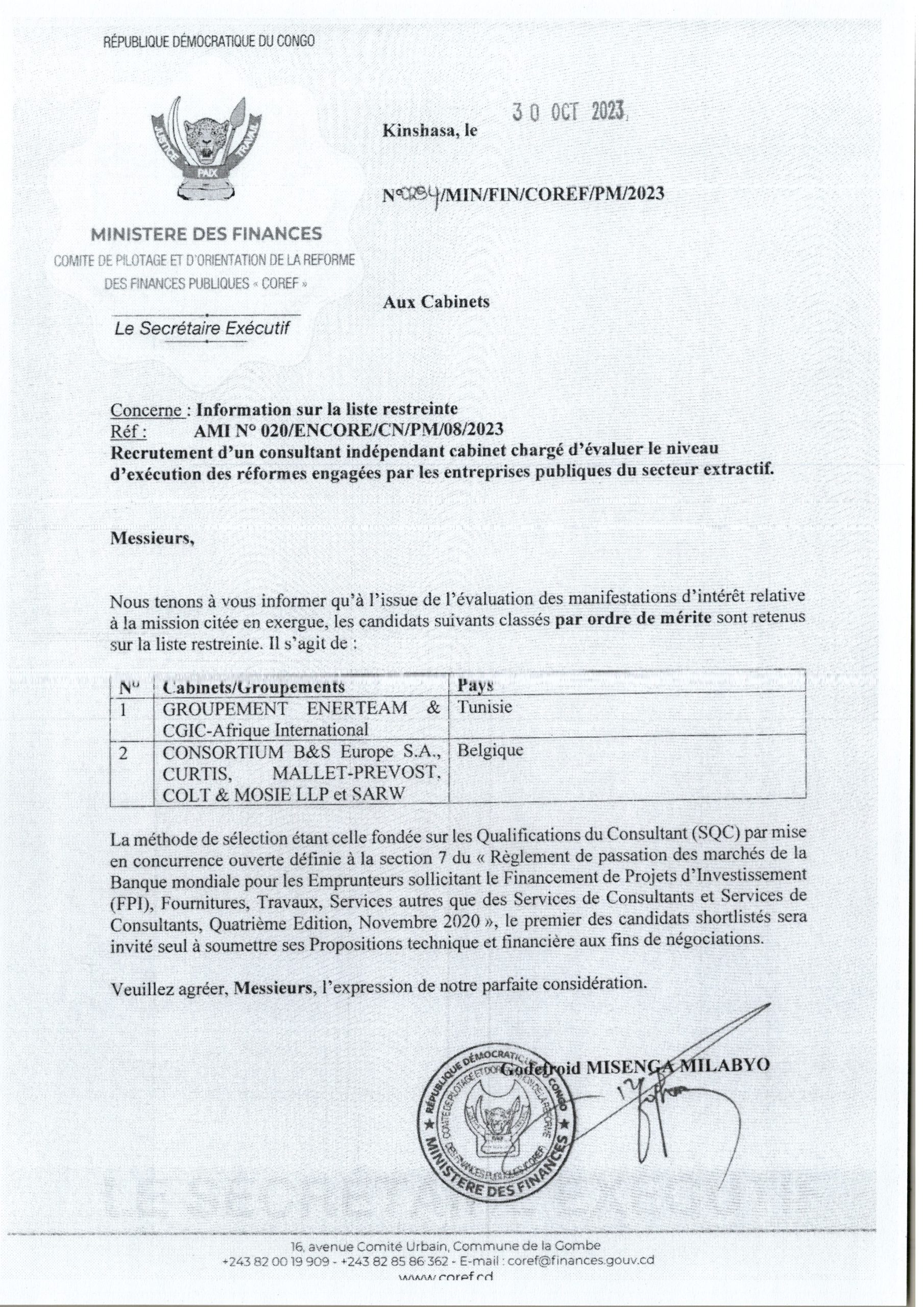 Liste Restreinte de la COREF relative au recrutement d’un consultant indépendant cabinet chargé d’évaluer le niveau d’exécution des réformes engagées par les entreprises publiques du secteur extractif
