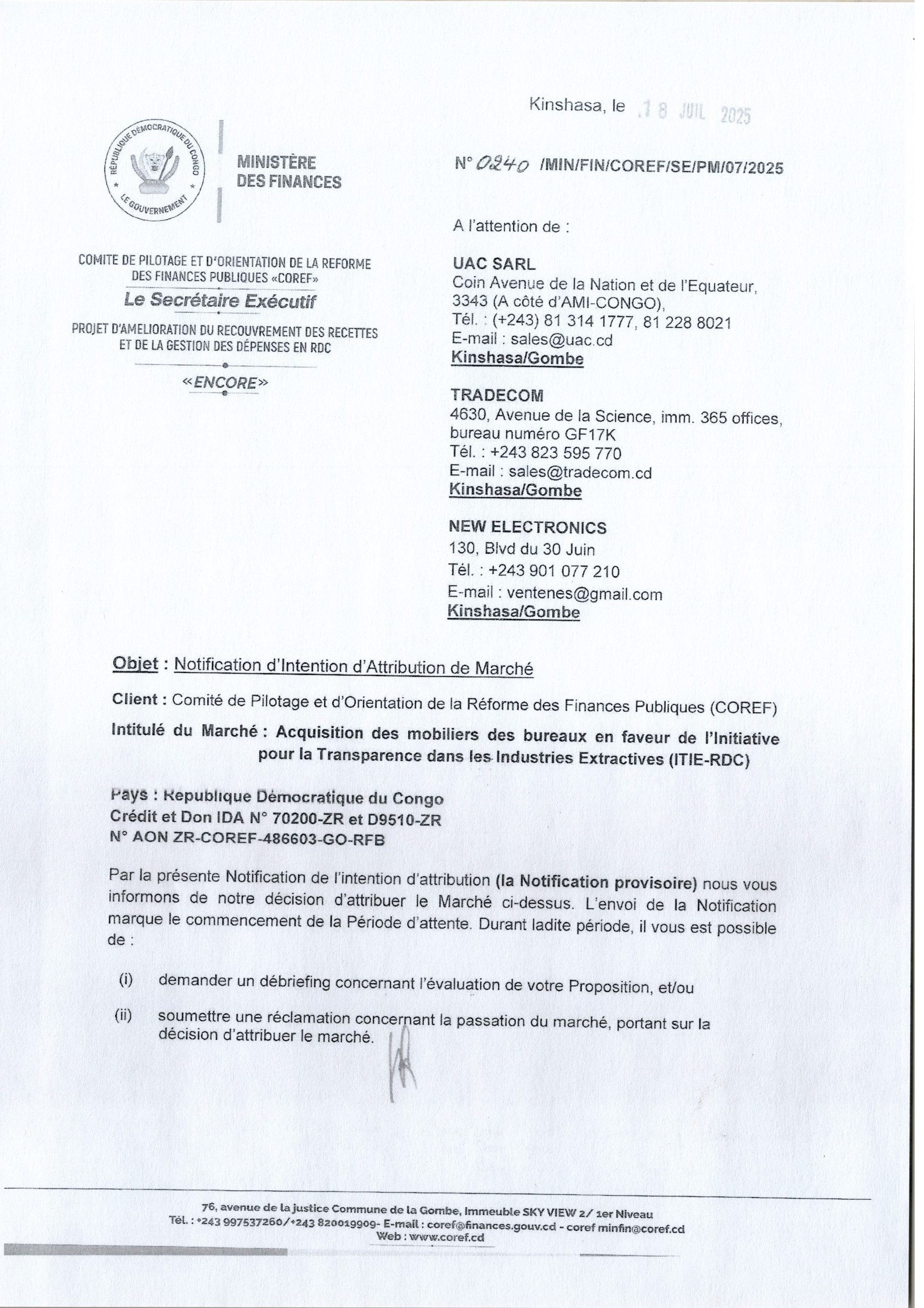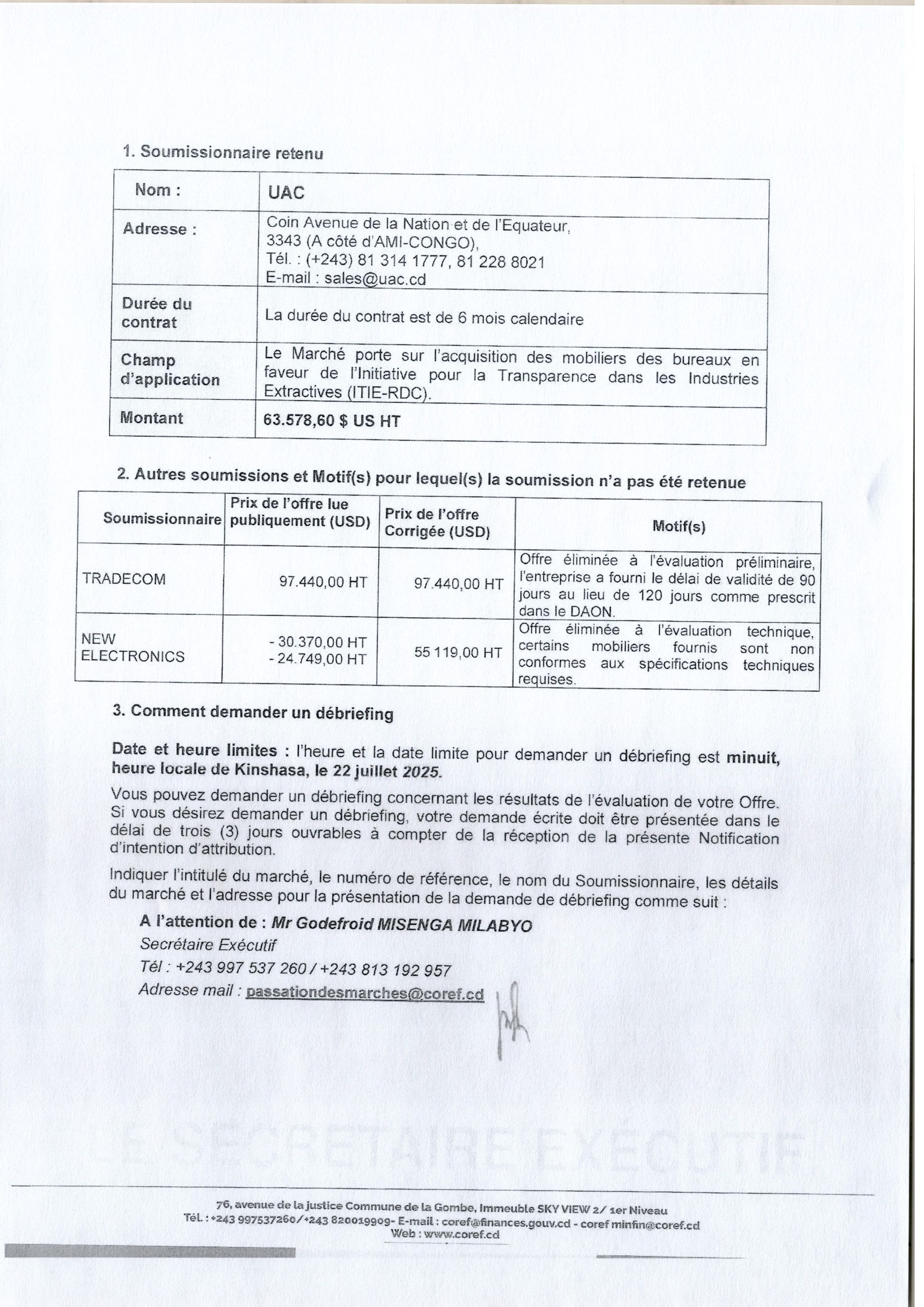 Marché attribué à la société UAC relatif à l’acquisition des mobiliers des bureaux en faveur de l’Initiative pour la transparence dans les Industries Extractives (ITIE-RDC)