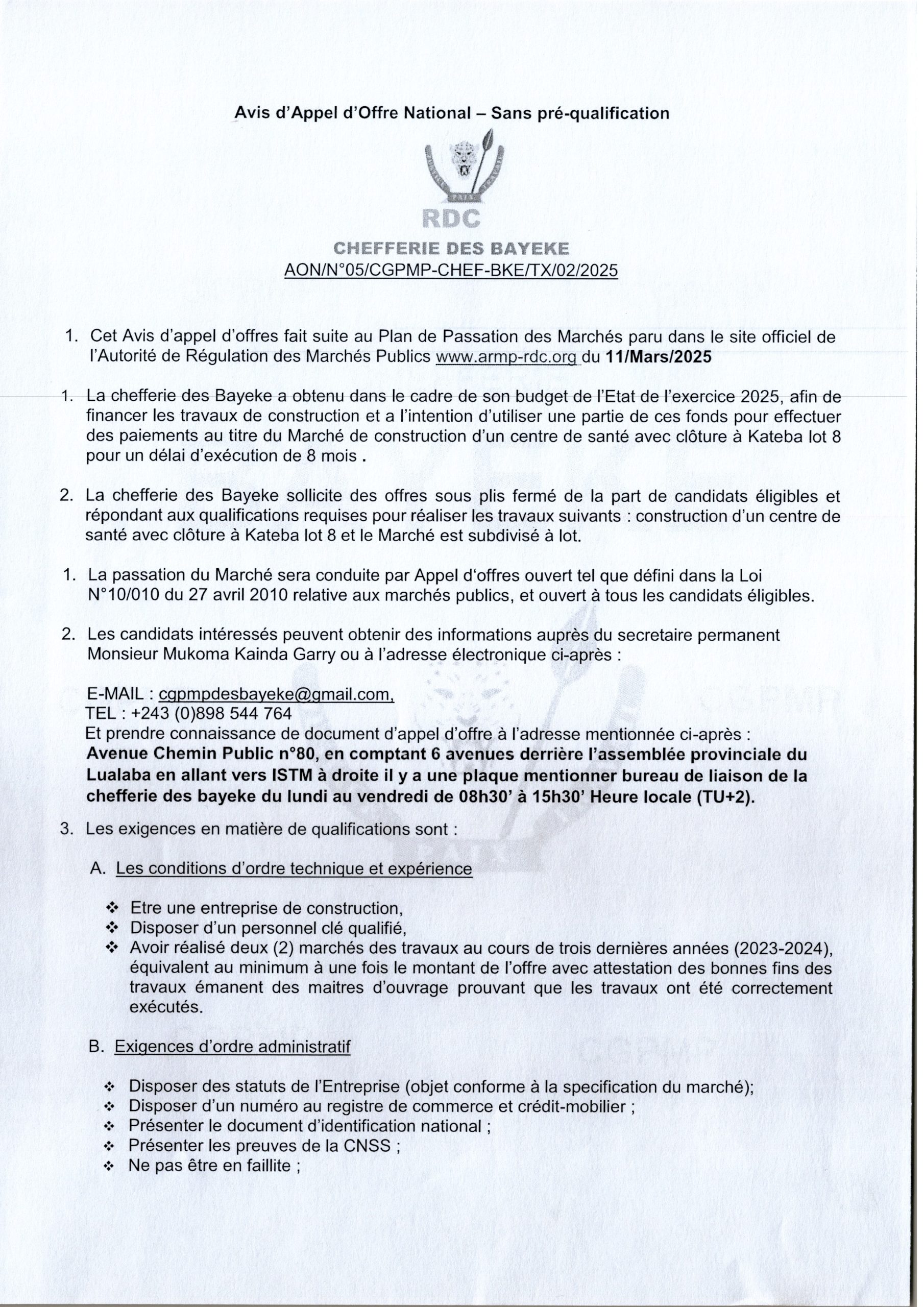 Marché de construction d’un centre de santé avec clôture à Kateba lot 8