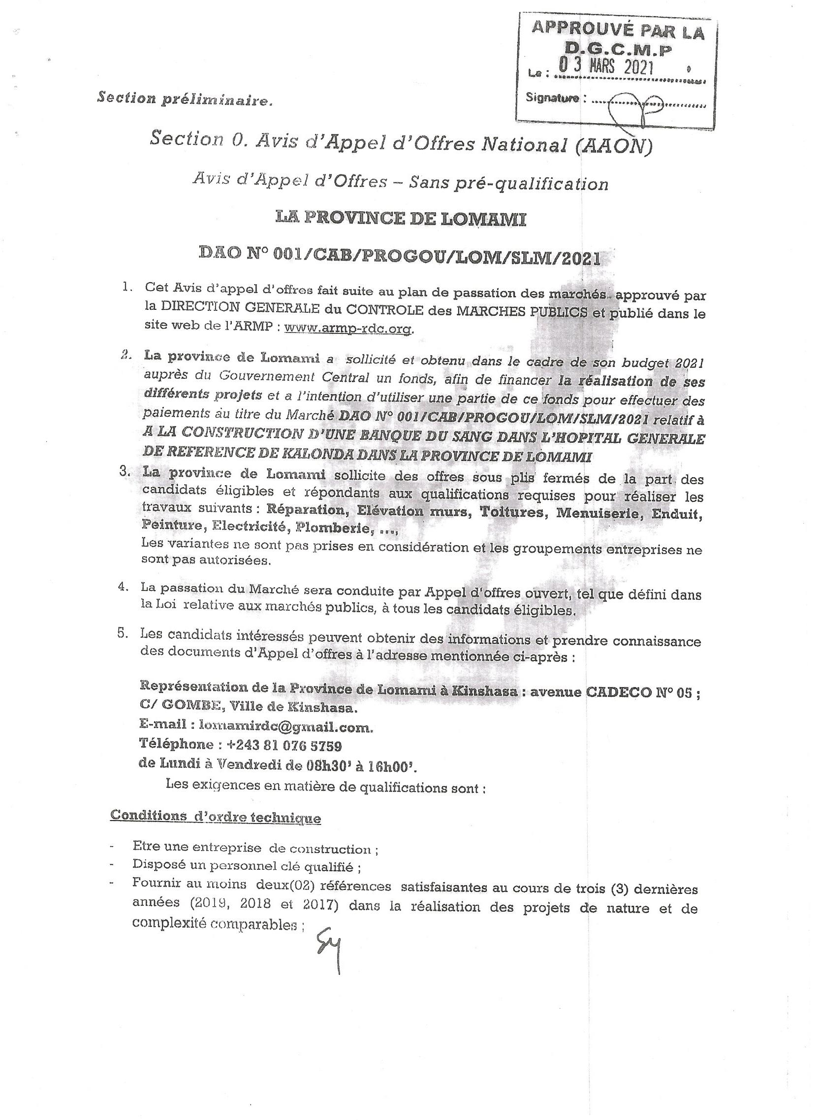 MARCHÉ DE CONSTRUCTION D’UNE BANQUE DU SANG DANS L’HÔPITAL GÉNÉRAL DE REFERENCE DE KALONDA DANS LA PROVINCE DE LOMAMI.