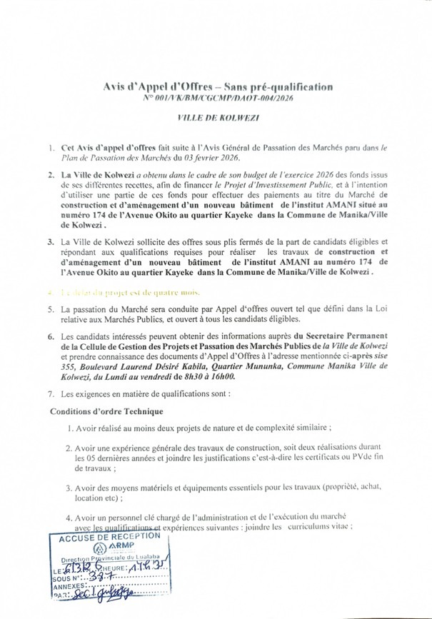 Marché de construction et d’aménagement d’un nouveau bâtiment de l’Institut AMANI dans la Commune de Manika/Kolwezi.