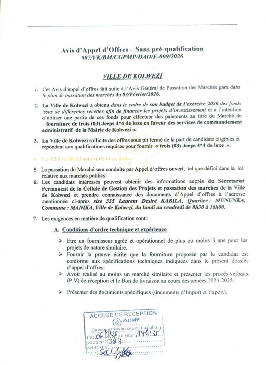 Marché de Fourniture de trois (03) Jeep 4×4 de luxe en faveur des services de Commandement Administratif de la Mairie de Kolwezi.