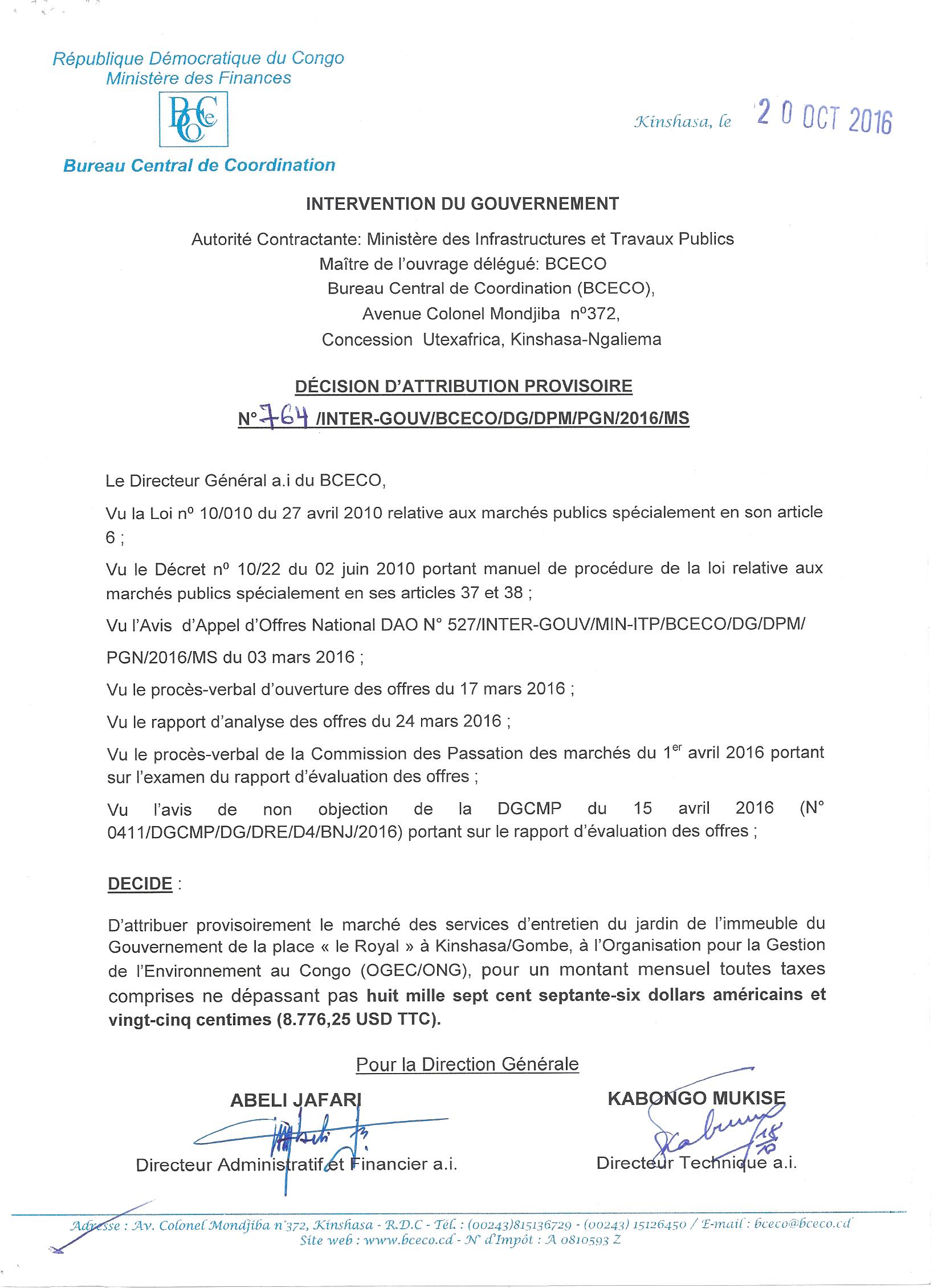 Marché des services d’entretien du jardin de l’immeuble du gouvernement de la place le royal à Kinshasa/Gombe, à l’ogec/org
