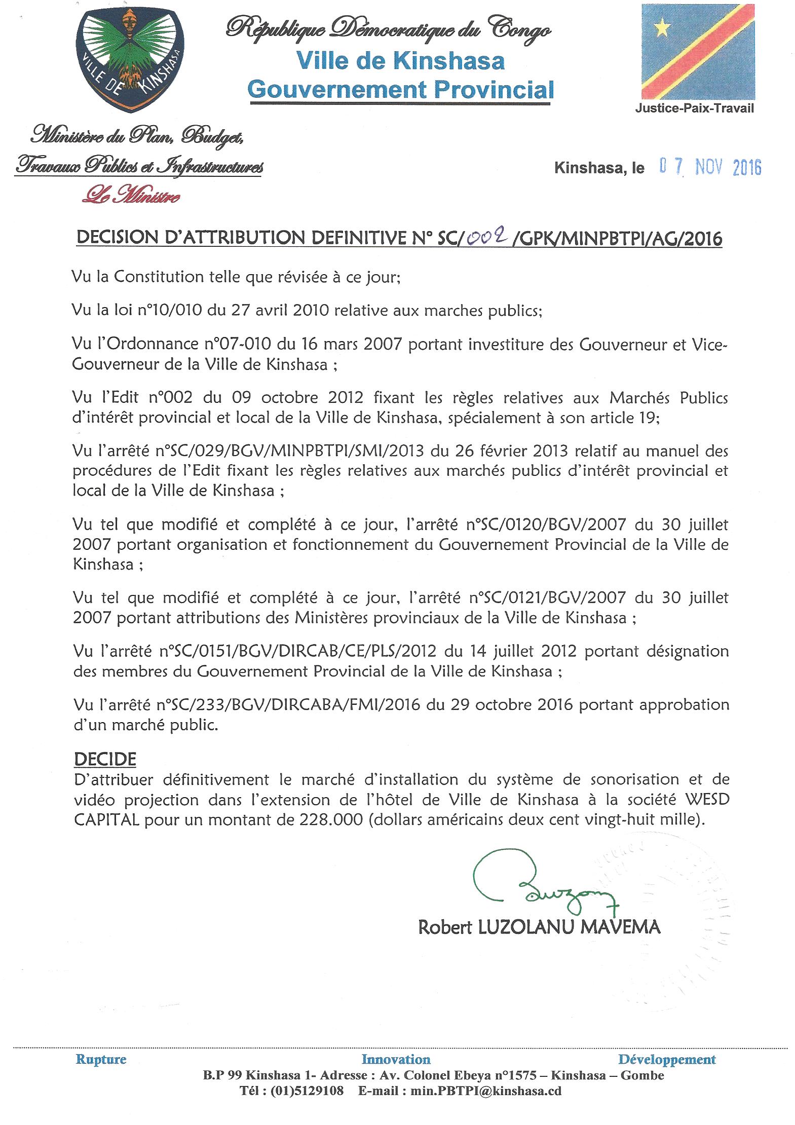 Marché d’installation du système de sonorisation et de vidéo projection dans l’extension de l’hôtel de ville de Kinshasa à la société WESD CAPITAL