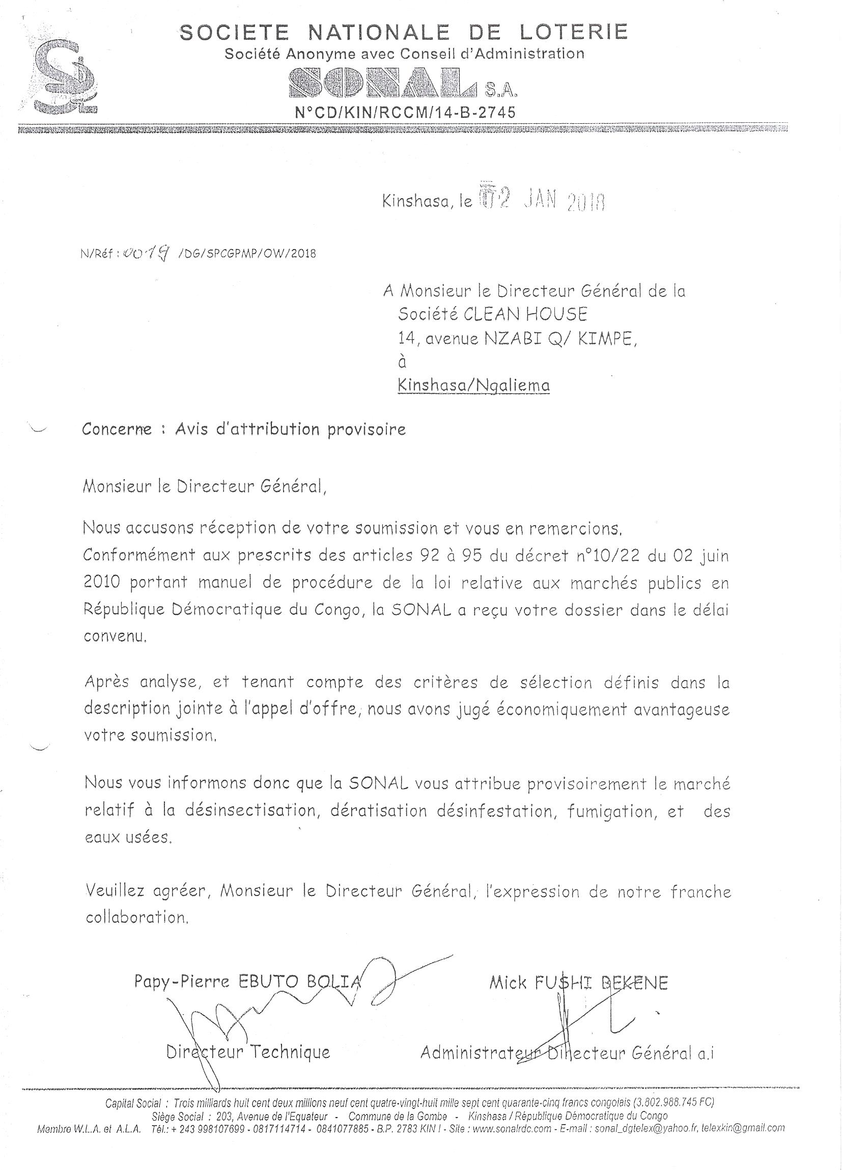 Marché relatif à la désinsectisation, dératisation désinfestation, fumigation et traitement des eaux usées à la société CLEAN HOUSE