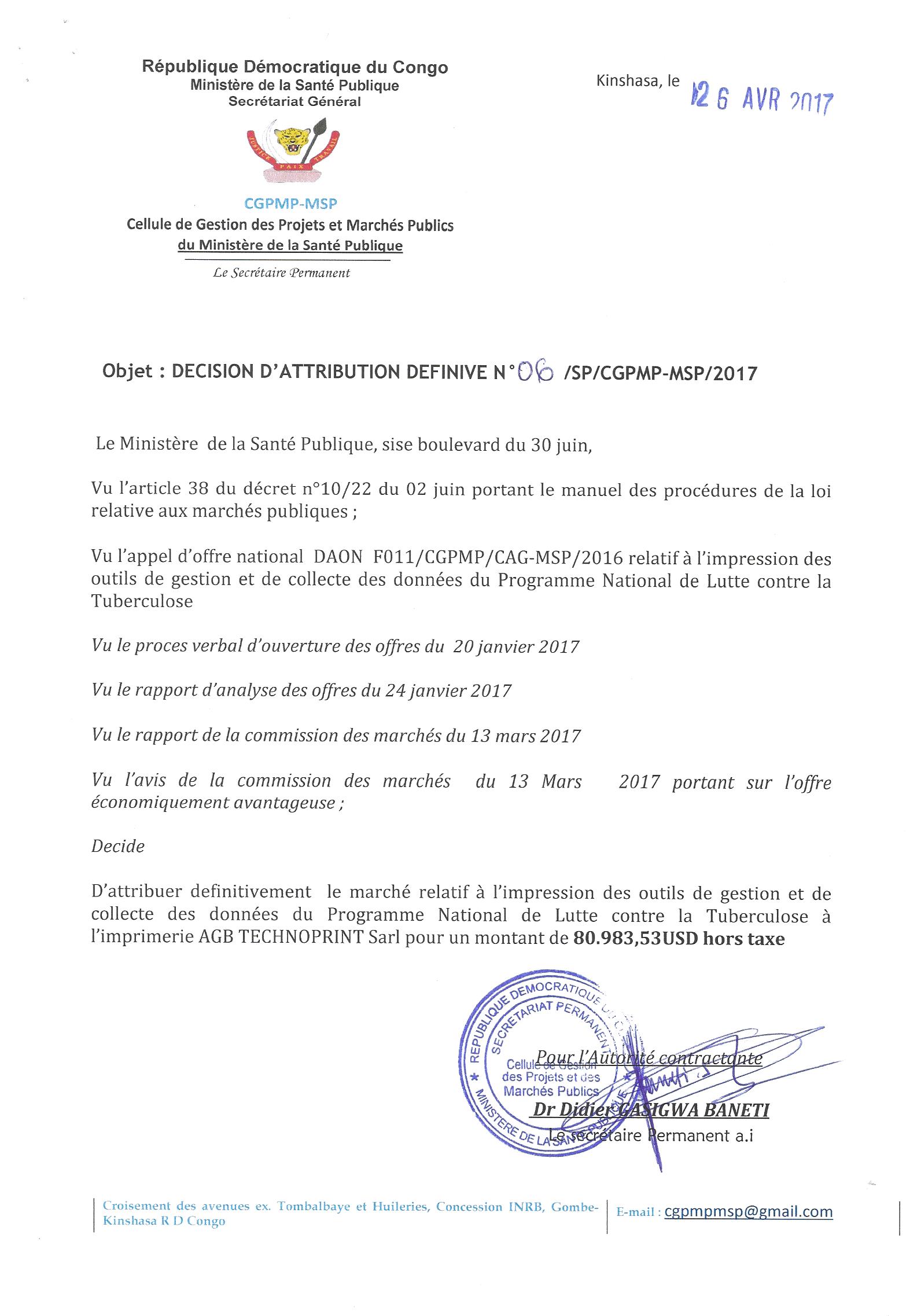 Marché relatif à l’impression des outils de gestion et de collecte des données du programme national de lutte contre la tuberculose à l’imprimerie AGB TECHNOPRINT SARL