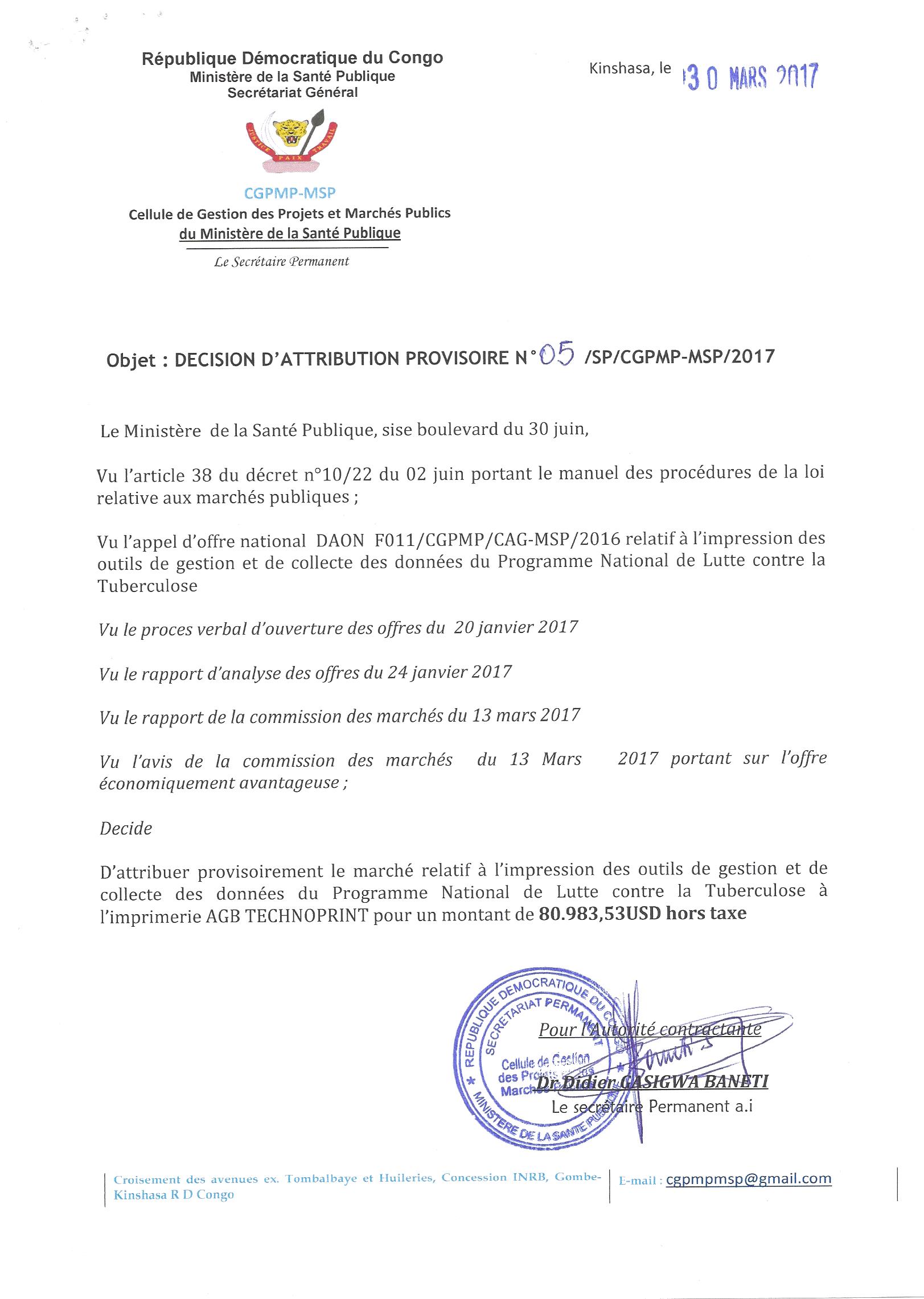 Marché relatif à l’impression des outils de gestion et de collecte des données du programme national de lutte contre la tuberculose à l’imprimerie AGB TECHNOPRINT