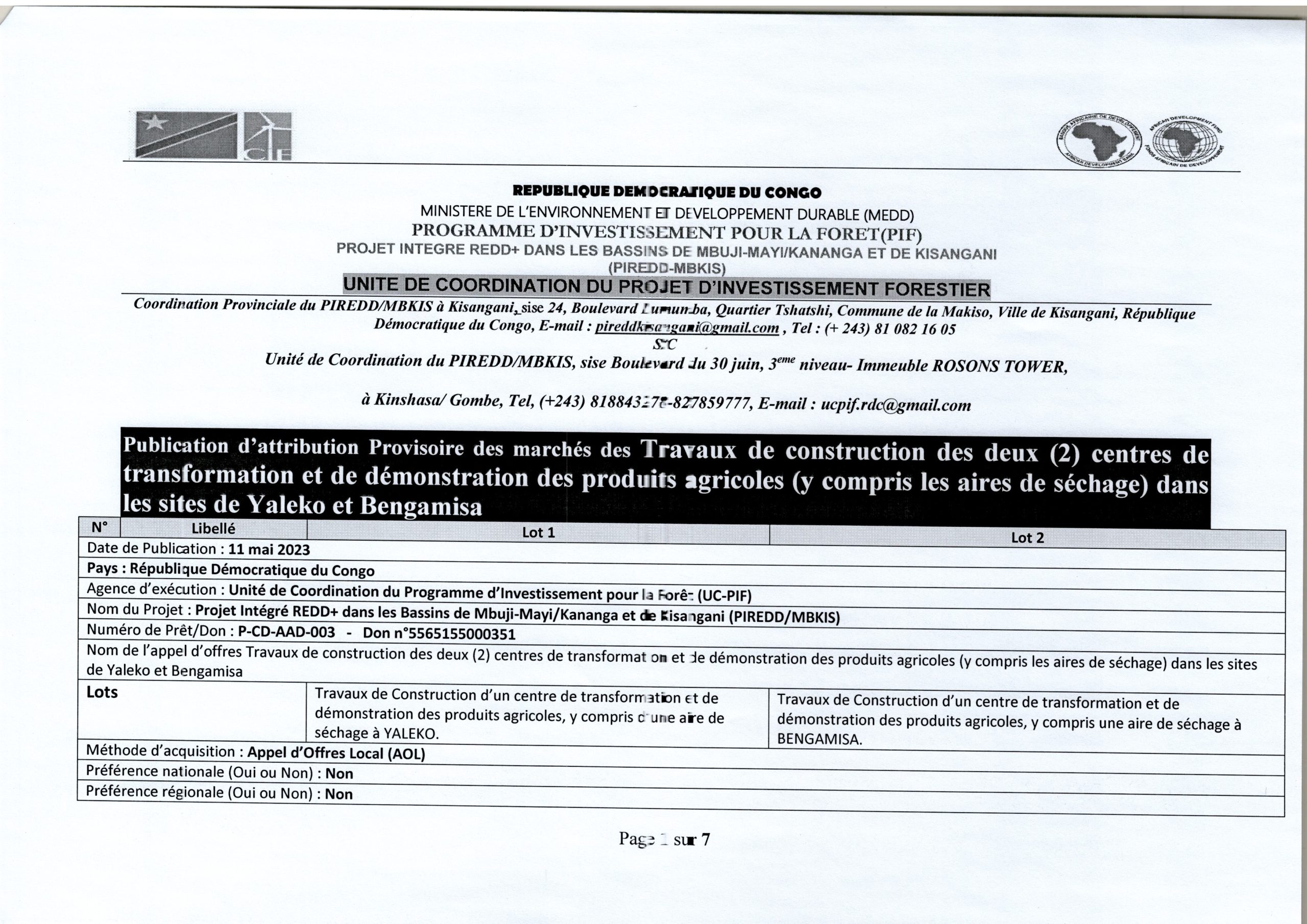 Attribution Provisoire des marchés des Travaux de construction des deux (2) centres de transformation et de démonstration des produits agricoles (y compris les aires de séchage) dans les sites de Yaleko et Bengamisa
