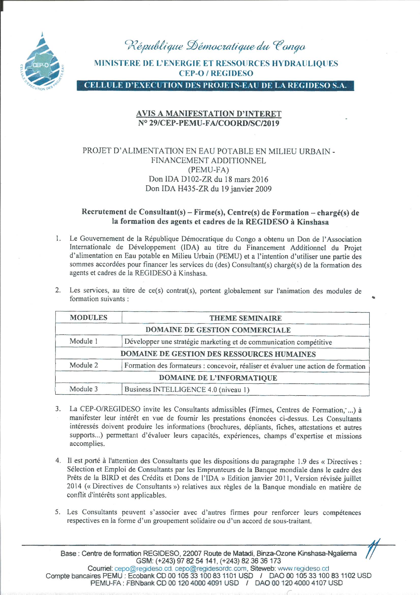 RECRUTEMENT DE CONSULTANT(S), CENTRE (S) DE FORMATION – CHARGÉ(S) DE LA FORMATION DES AGENTS ET CADRES DE LA REGIDESO À KINSHASA. N°29.