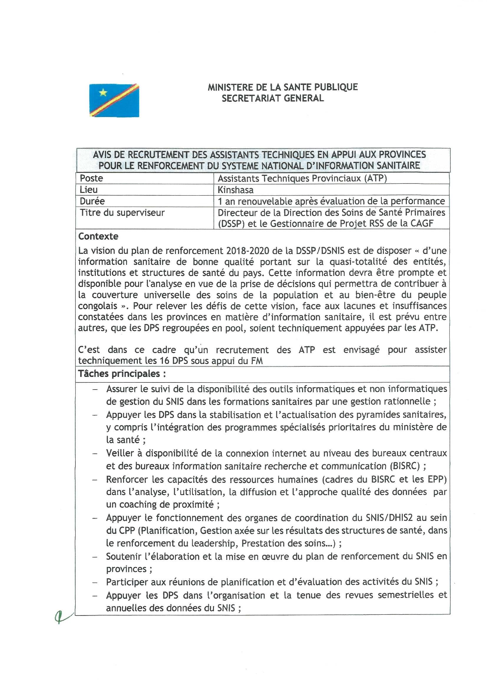 RECRUTEMENT DES ASSISTANTS TECHNIQUES EN APPUI AUX PROVINCES POUR LE RENFORCEMENT DU SYSTÈME NATIONAL D’INFORMATION SANITAIRE.