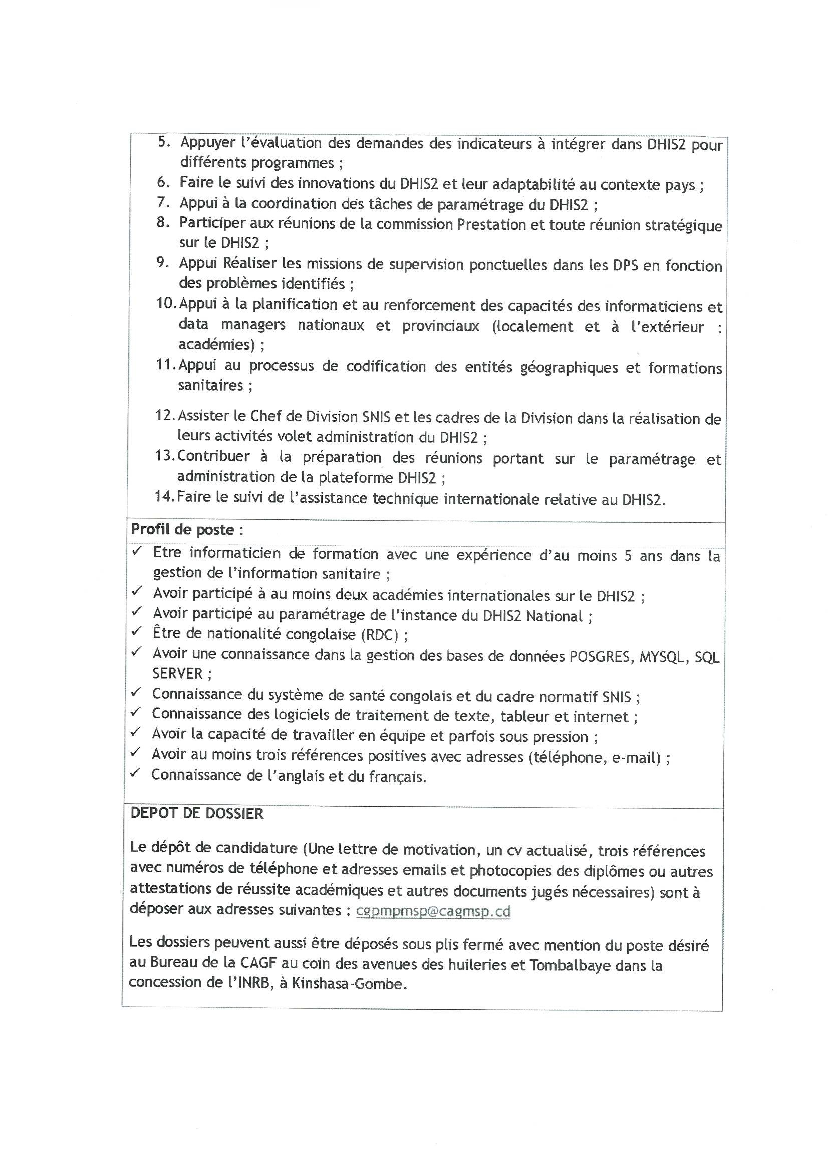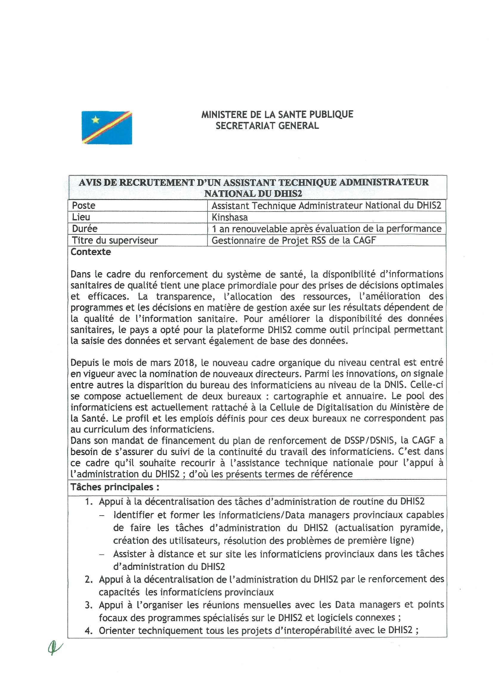RECRUTEMENT D’UN ASSISTANT TECHNIQUE ADMINISTRATEUR NATIONAL DU DHIS2.