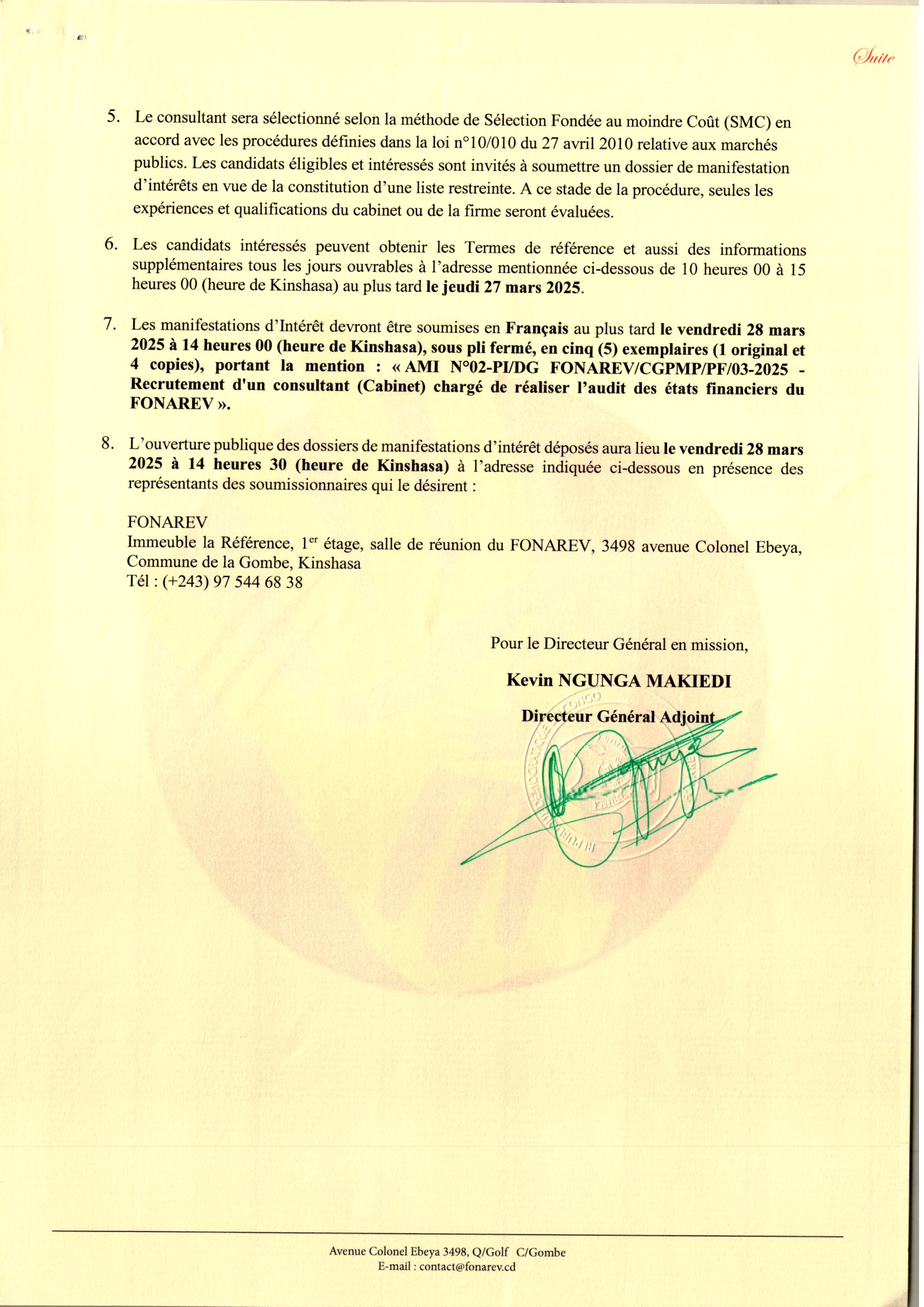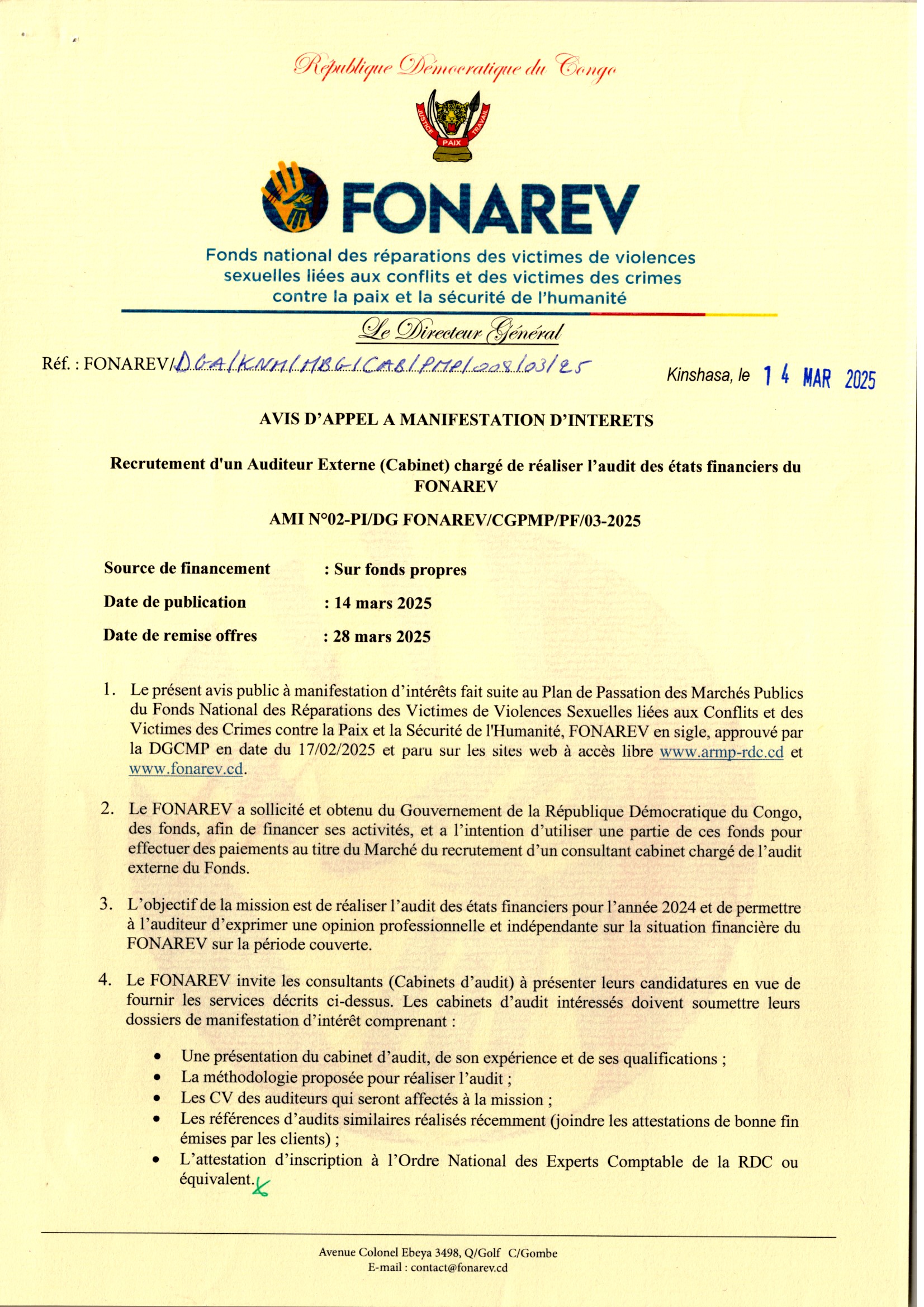 Recrutement d’un Auditeur Externe (Cabinet) chargé de réaliser l’audit des états financiers du FONAREV.