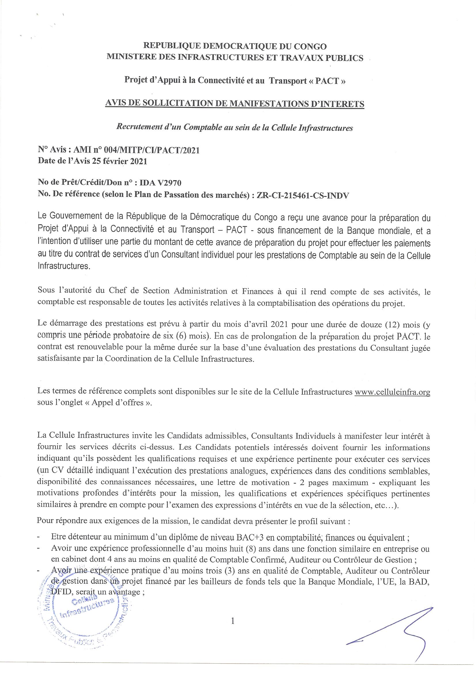 Recrutement d’un comptable au sein de la cellule infrastructures.