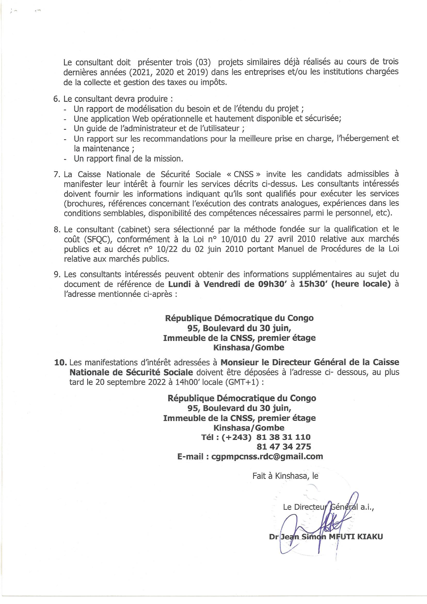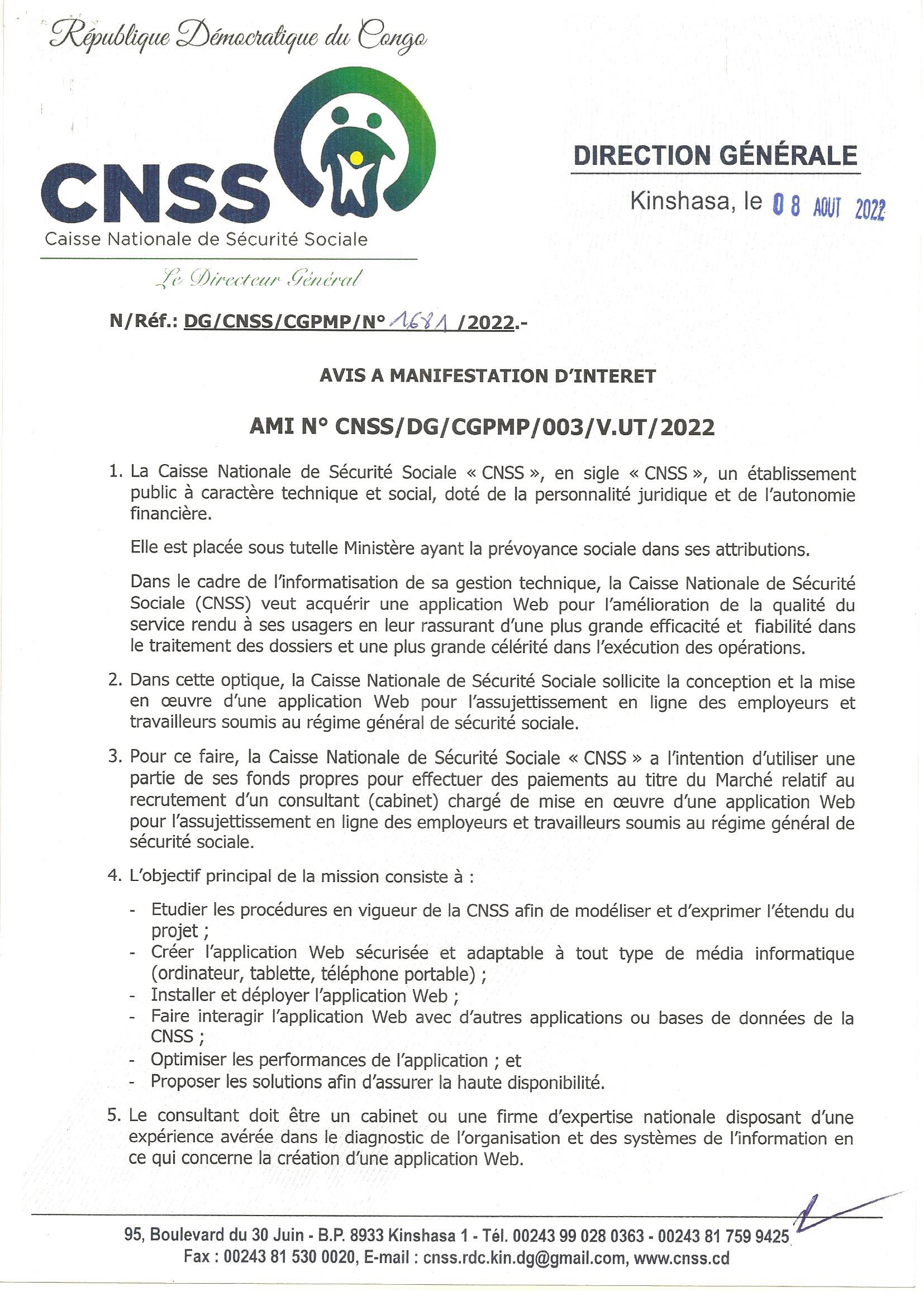 RECRUTEMENT D’UN CONSULTANT (cabinet) CHARGE DE MISE EN OEUVRE D’UNE APPLICATION WEB POUR L’ASSUJETTISSEMENT EN LIGNE DES EMPLOYEURS ET TRAVAILLEURS SOUMIS AU REGIME GENERAL DE SECURITE SOCIALE.