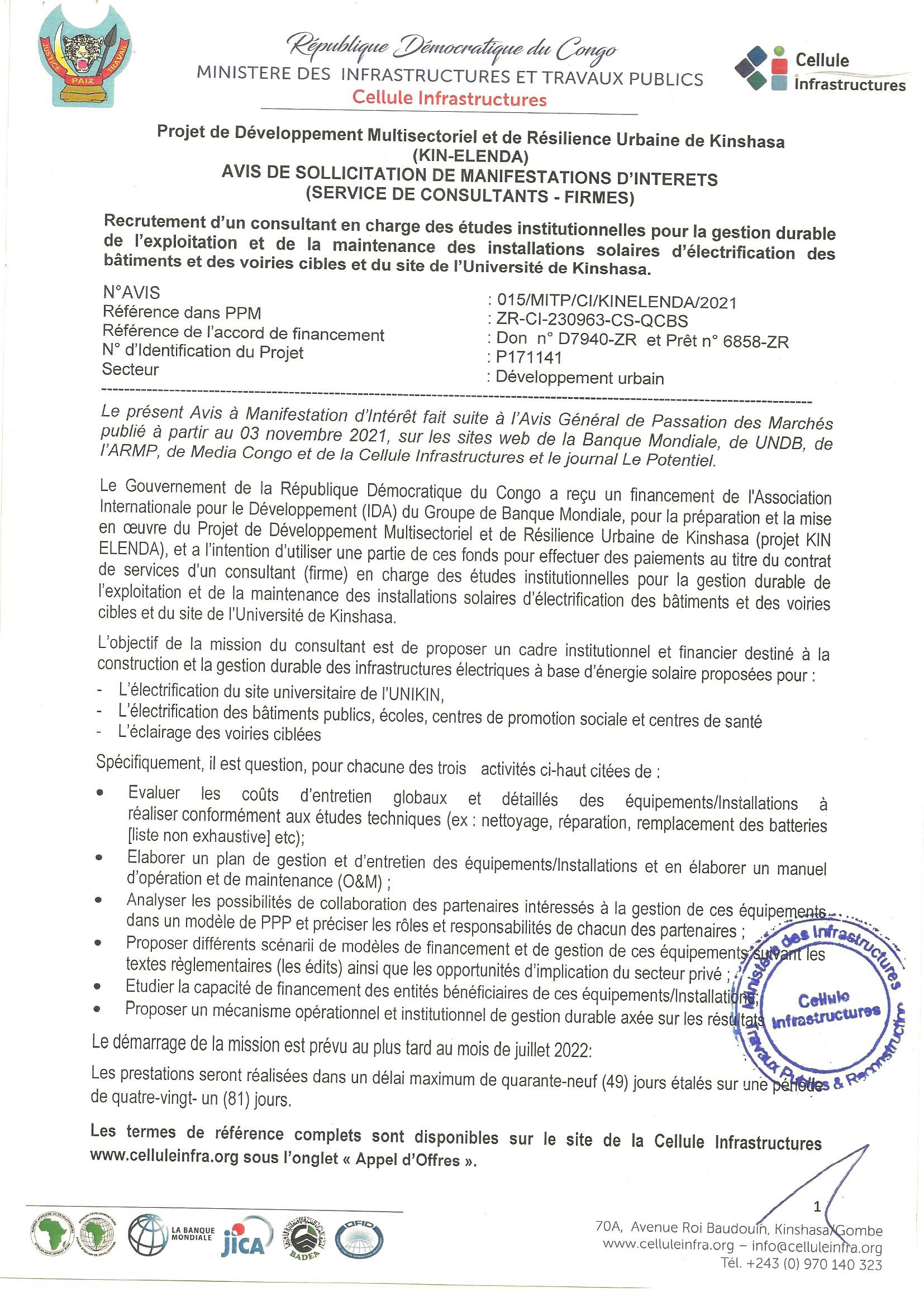 RECRUTEMENT D’UN CONSULTANT EN CHARGE DES ETUDES INSTITUTIONNELLES POUR LA GESTION DURABLE DE L’EXPLOITATION ET DE LA MAINTENANCE DES INSTALLATIONS SOLAIRES D’ELECTRIFICATION DES BATIMENTS ET DES VOIRIES CIBLES ET DU SITE DE L’UNIVERSITE DE KINSHASA.