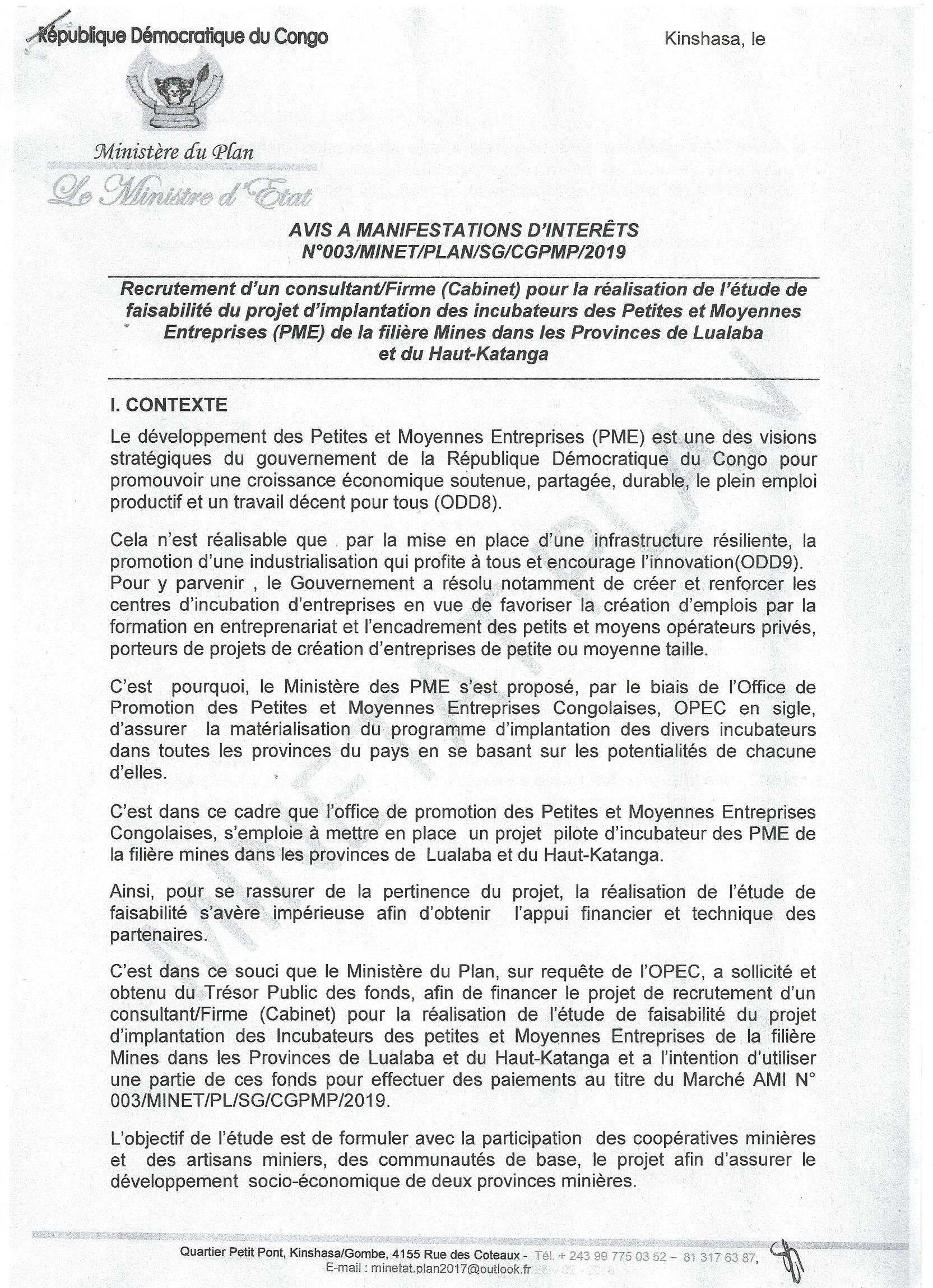 Recrutement d’un Consultant/firme (cabinet) pour la réalisation de l’étude de faisabilité du projet d’implantation des incubateurs des Petites et Moyennes Entreprise (PME) de la filière Mines dans les Provinces de Lualaba et du Haut-Katanga